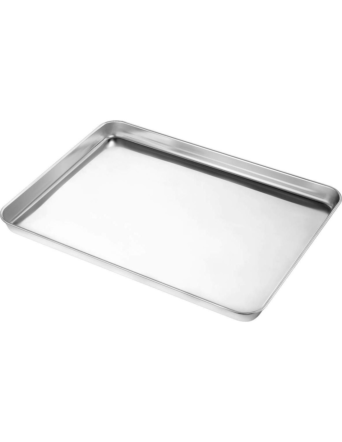 - MATERIAL PREMIUM: No más aluminio en tu comida, gran reemplazo para la bandeja de aluminio. La bandeja para hornear está hecha de acero inoxidable puro de alta calidad sin recubrimiento químico ni otros materiales