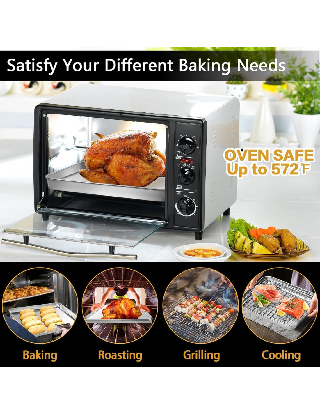 - JUEGO COMPLETO DE HORNEADO: El set de bandejas para horno es de 6 piezas, que incluye 3 bandejas para hornear de diferentes tamaños: bandeja para hornear grande (40.6 x 30.5 x 2.5 cm), bandeja para hornear de cuarto (30.5 x 25.4 x 2.5 cm) y bandeja para hornear pequeña (22.9 x 17.8 x 2.5 cm) y 3 rejillas de enfriamiento que coinciden con cada tamaño. Cada rejilla de asar se ajusta perfectamente en las bandejas para hornear, adecuada para la mayoría de los hornos tostadores regulares. Perfecto para hornear tocino, pollo, pan, pasteles, galletas, brownies, hacer cobblers de frutas, enfriar galletas y pasteles y drenar agua o aceite.
