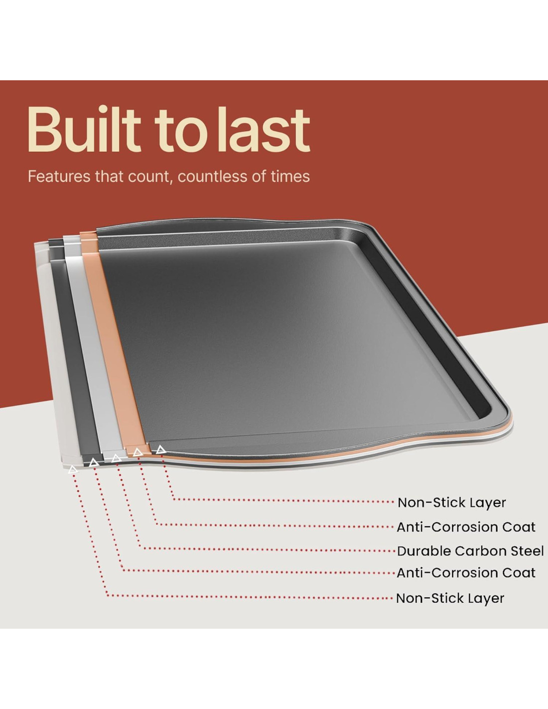 - RESISTENTES AL CALOR: Nuestro juego de hornear es apto para lavavajillas y es libre de PFOA, PFOS y PTFE, lo que lo hace seguro para tu familia. Estas bandejas para hornear proporcionan una excelente liberación de alimentos al hornear, asar, etc., y facilitan la limpieza.