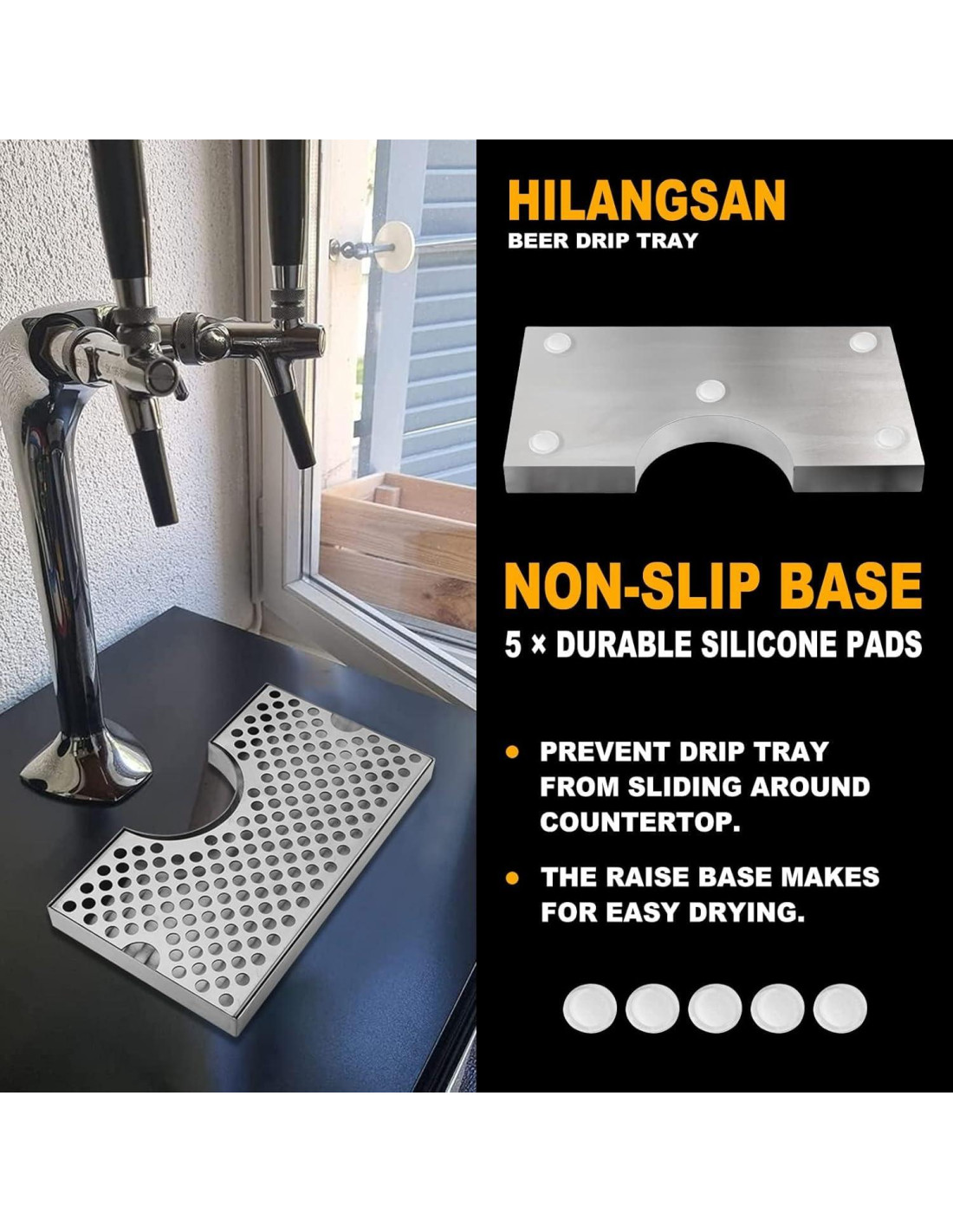 - Diseño de Base Antideslizante: La bandeja de goteo de cerveza para kegerator viene con cinco almohadillas de silicona antideslizantes que se adhieren a la parte inferior de la bandeja de goteo para barril, manteniendo la bandeja de goteo de cerveza firmemente en su lugar debajo de la torre de cerveza. Esto asegura una bandeja de goteo para kegerator estable, evitando que la bandeja de goteo del bar se deslice. Esta bandeja de goteo para grifo de cerveza es una opción ideal para bares ocupados y áreas de alto tráfico.