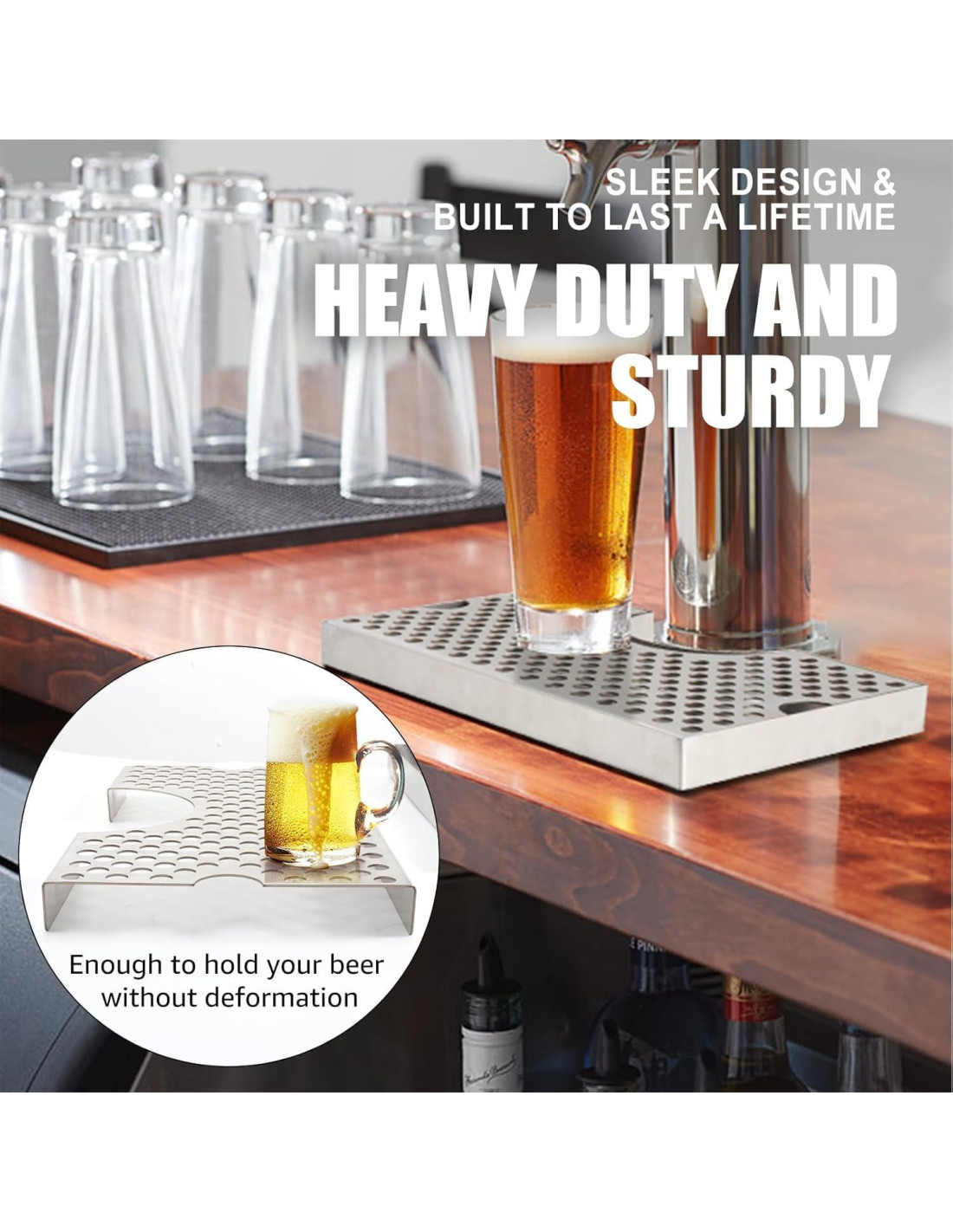 - Diseño de Base Antideslizante: La bandeja de goteo de cerveza para kegerator viene con cinco almohadillas de silicona antideslizantes que se adhieren a la parte inferior de la bandeja de goteo de barril, manteniendo la bandeja de goteo de cerveza firmemente en su lugar debajo de la torre de cerveza. Esto asegura una bandeja de goteo de kegerator estable, evitando que la bandeja de goteo del bar se deslice. Esta bandeja de goteo para grifo de cerveza es una opción ideal para bares ocupados y áreas de alto tráfico