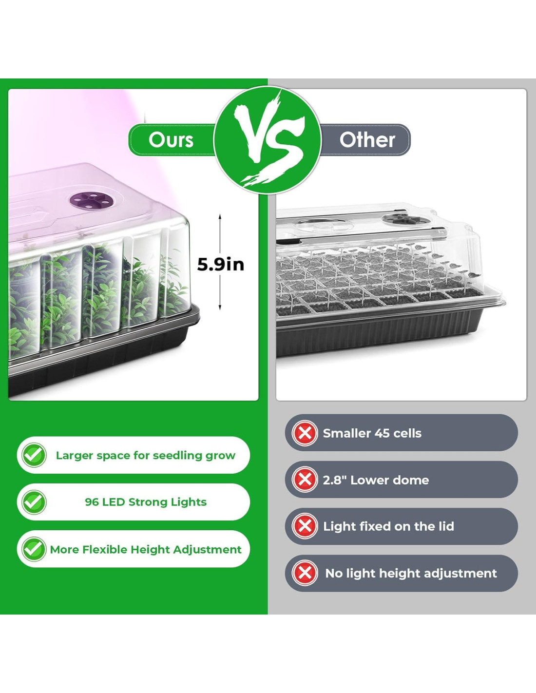 - Más Espacio y Material Resistente: La bandeja de semillas 1020 plana y el dome de humedad extra alto de 5.9 pulgadas proporcionan más espacio para el crecimiento de semillas. La bandeja de inicio de semillas está hecha de plástico grueso y resistente, se espera que dure años, lo que la convierte en una gran inversión para los amantes de la jardinería.