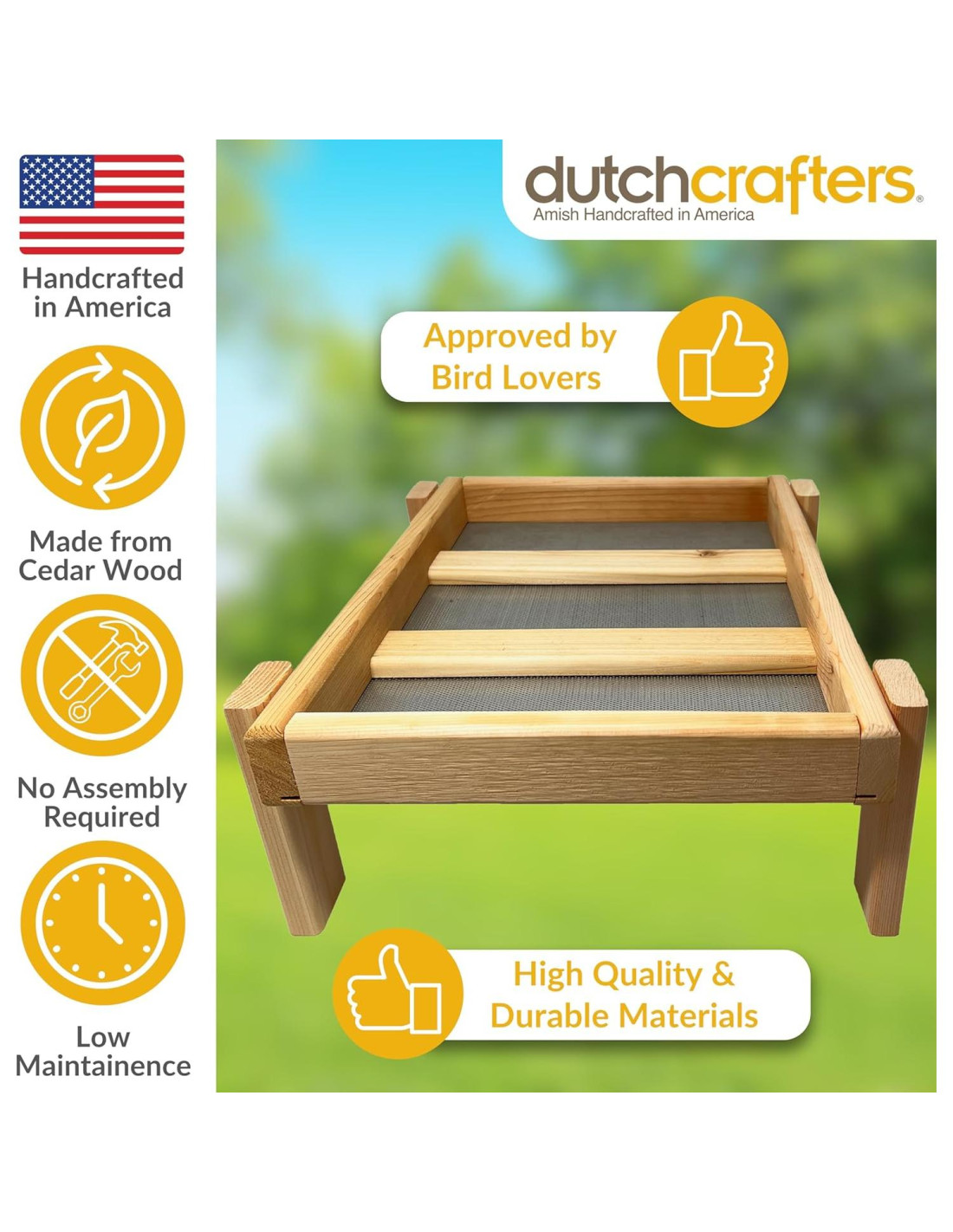 - Alimentador de Aves de Madera - Nuestros alimentadores de aves en plataforma para exteriores están hechos de madera de cedro natural y duradera que puede manejar las condiciones exteriores con facilidad. Se utiliza herrajes de acero inoxidable para ensamblar nuestros alimentadores de aves en plataforma