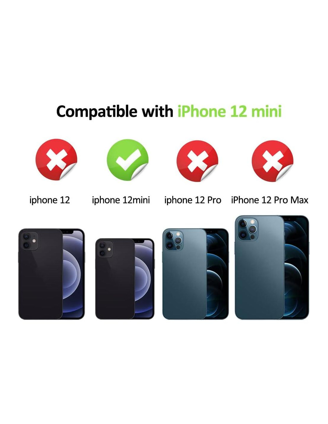- Compatible solo con iPhone 12 mini versiones: A2399 (Internacional); A2176 (EE. UU.); A2398 (Canadá, Japón)