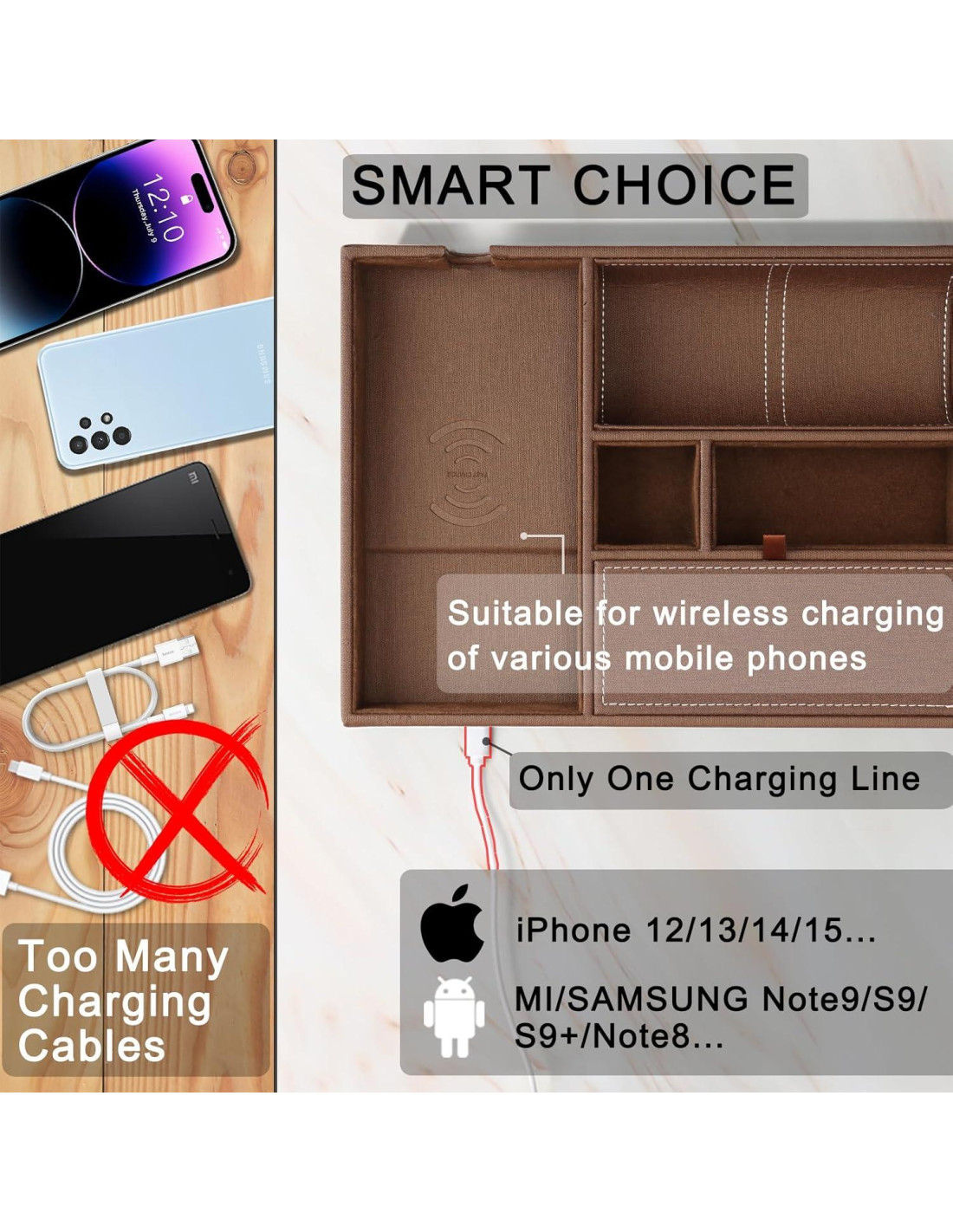 - Regalo Perfecto La Bandeja de Cuero PU SANZIE con Cargador Inalámbrico viene en una hermosa caja de regalo texturizada, lo que la convierte en un artículo de regalo perfecto para tus seres queridos. Puede usarse en la mesita de noche, armario, mesa lateral o entrada.