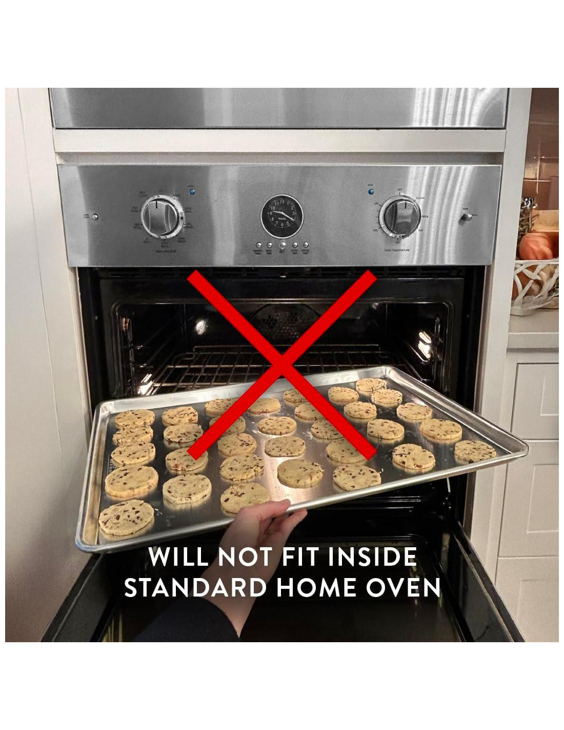 - Las bandejas de tamaño completo están hechas para uso en hornos comerciales y no caben en hornos domésticos estándar, asegúrate de medir las dimensiones interiores de tu horno para confirmar que esta bandeja comercial de gran tamaño será compatible