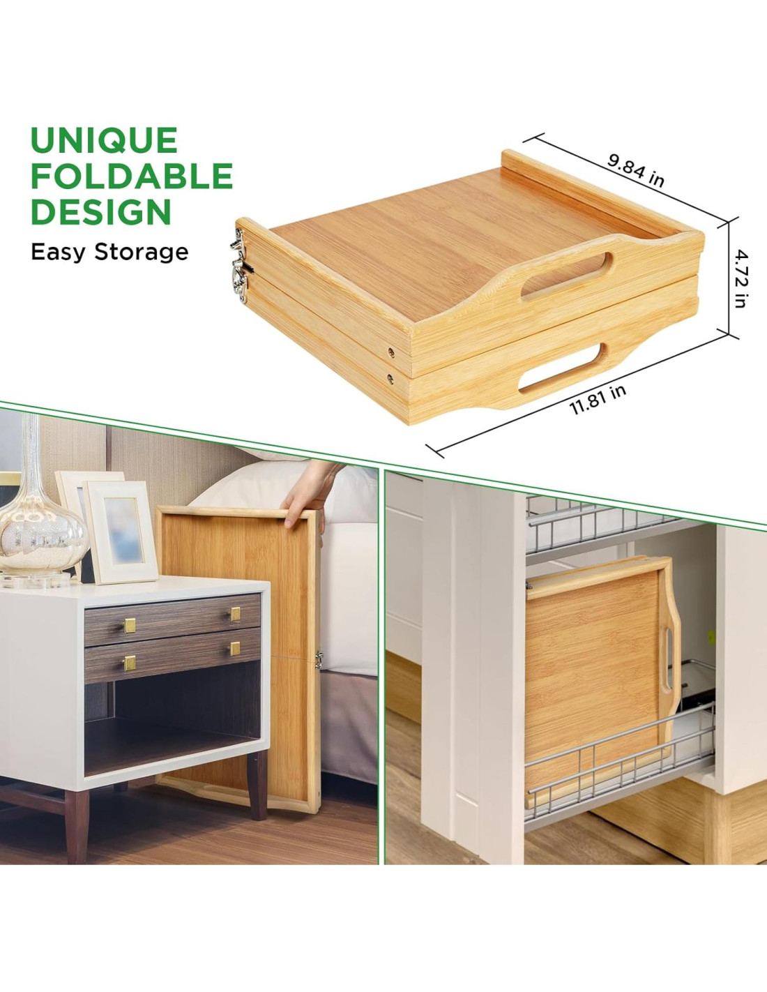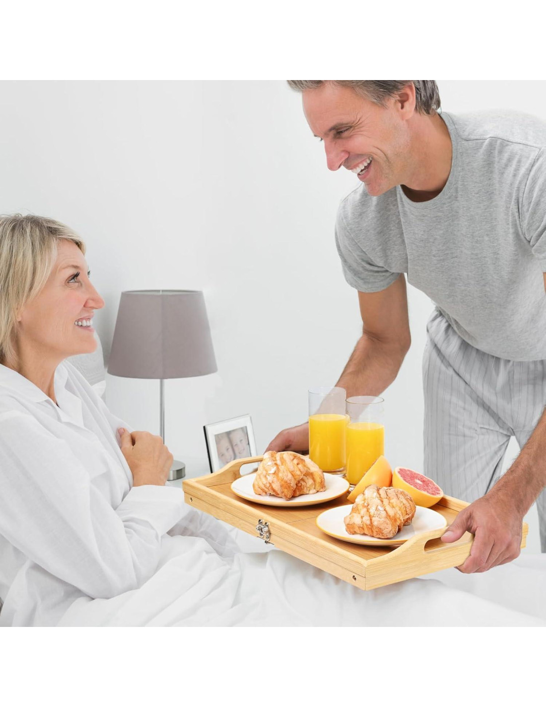 - Ahorra Espacio y Previene Derrames: Las patas plegables permiten que la bandeja se coloque plana y ahorra más espacio al almacenarla. El borde alrededor de la bandeja evita que los objetos se caigan. No te preocupes por ningún líquido derramándose de la bandeja de desayuno y manchando tu ropa.