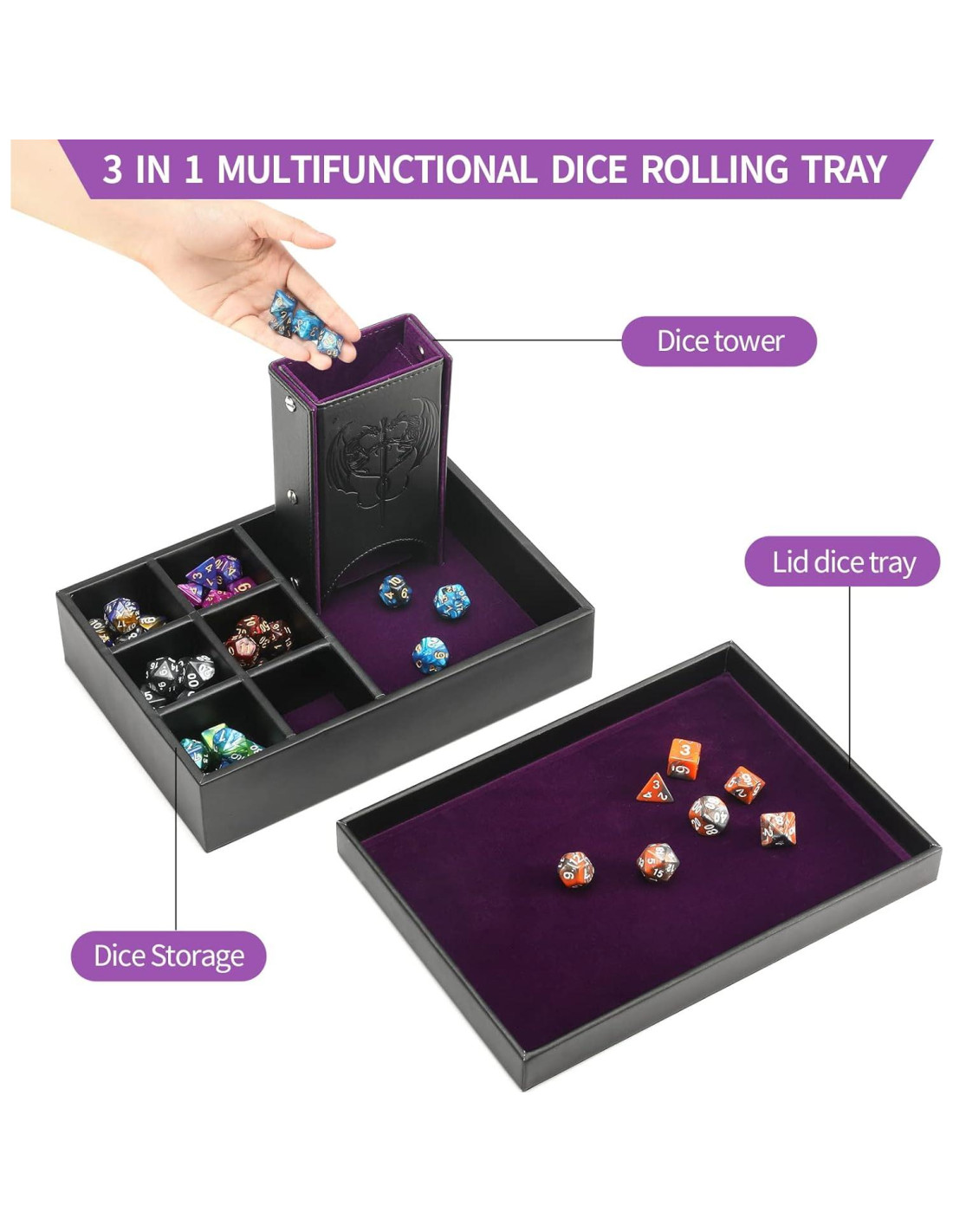 - [Torre de Dados 3 en 1] - El producto consta de tres funciones: bandeja de dados + torre de dados + almacenamiento de dados; fácil de llevar y ahorra espacio. El accesorio perfecto para juegos de DND para viajar, te permite hacer lanzamientos en casa o en movimiento