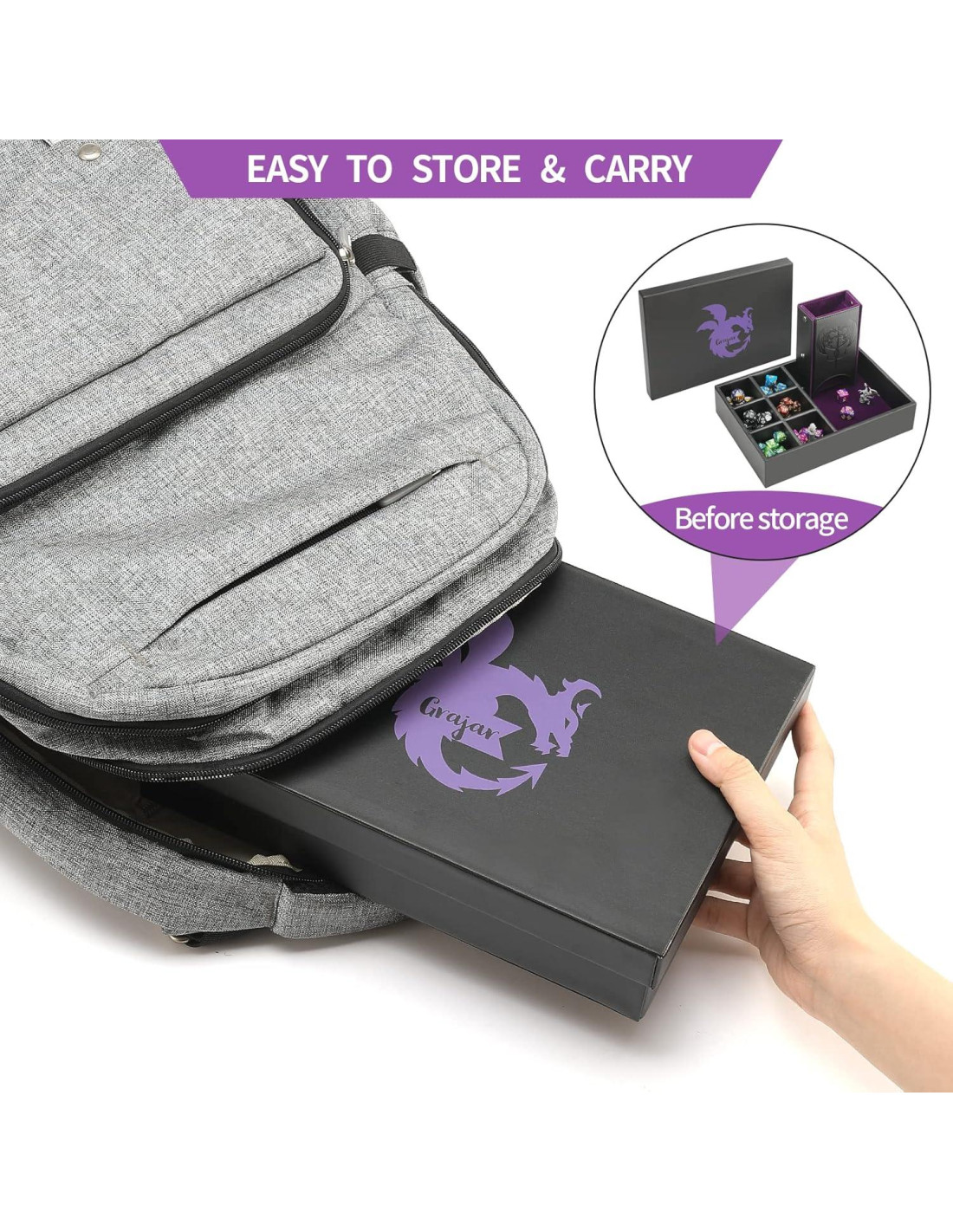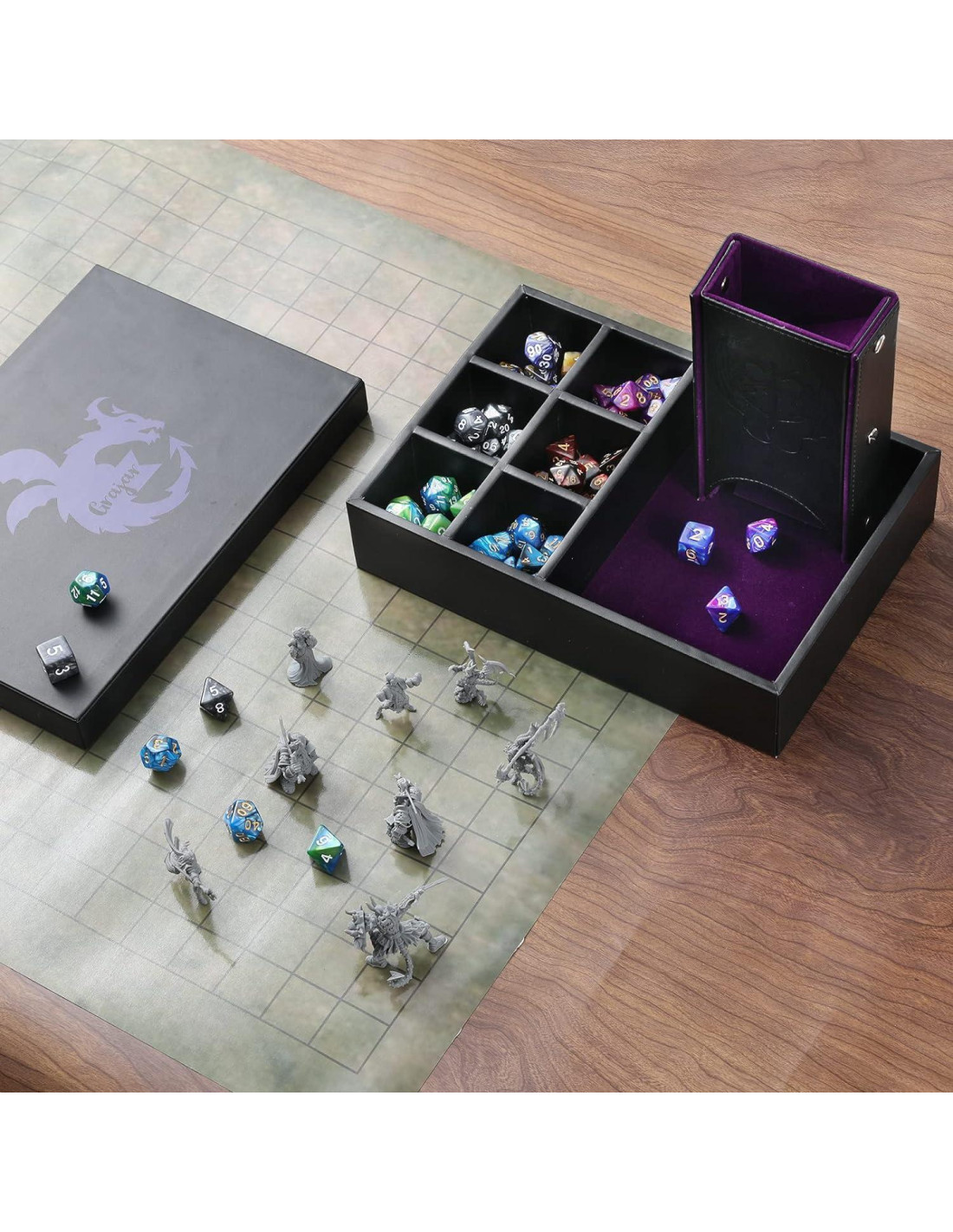 - [Bandeja de Dados con Tapa] - La tapa se puede voltear y usar como una bandeja de dados separada para compartir con tus compañeros de juego. No más preocupaciones por dejar caer o perder dados y que el juego se interrumpa por esto