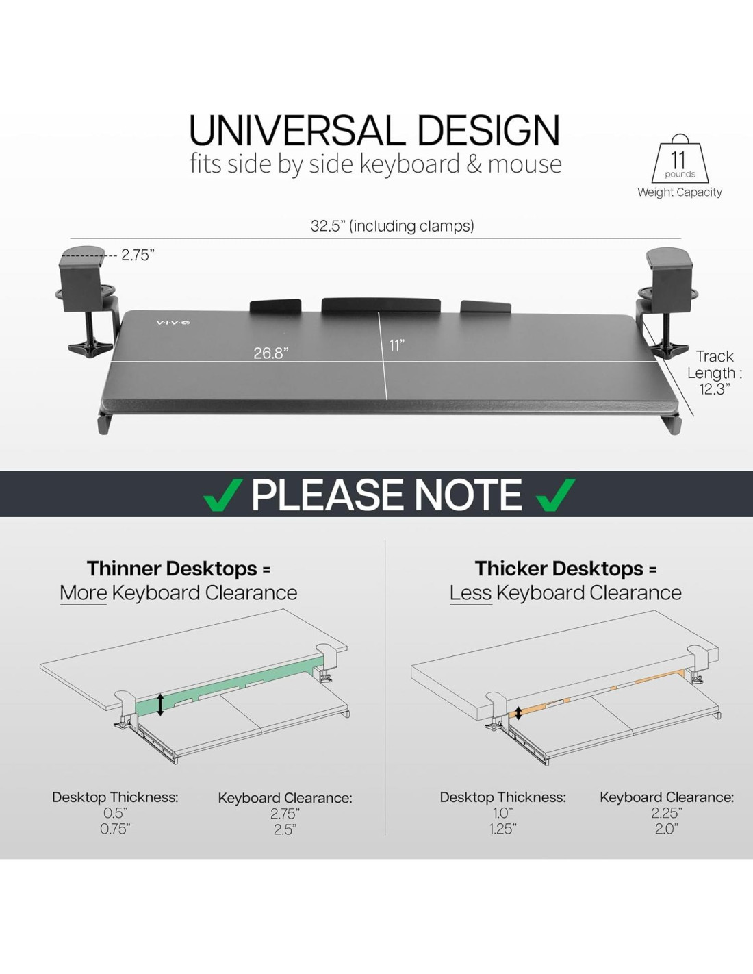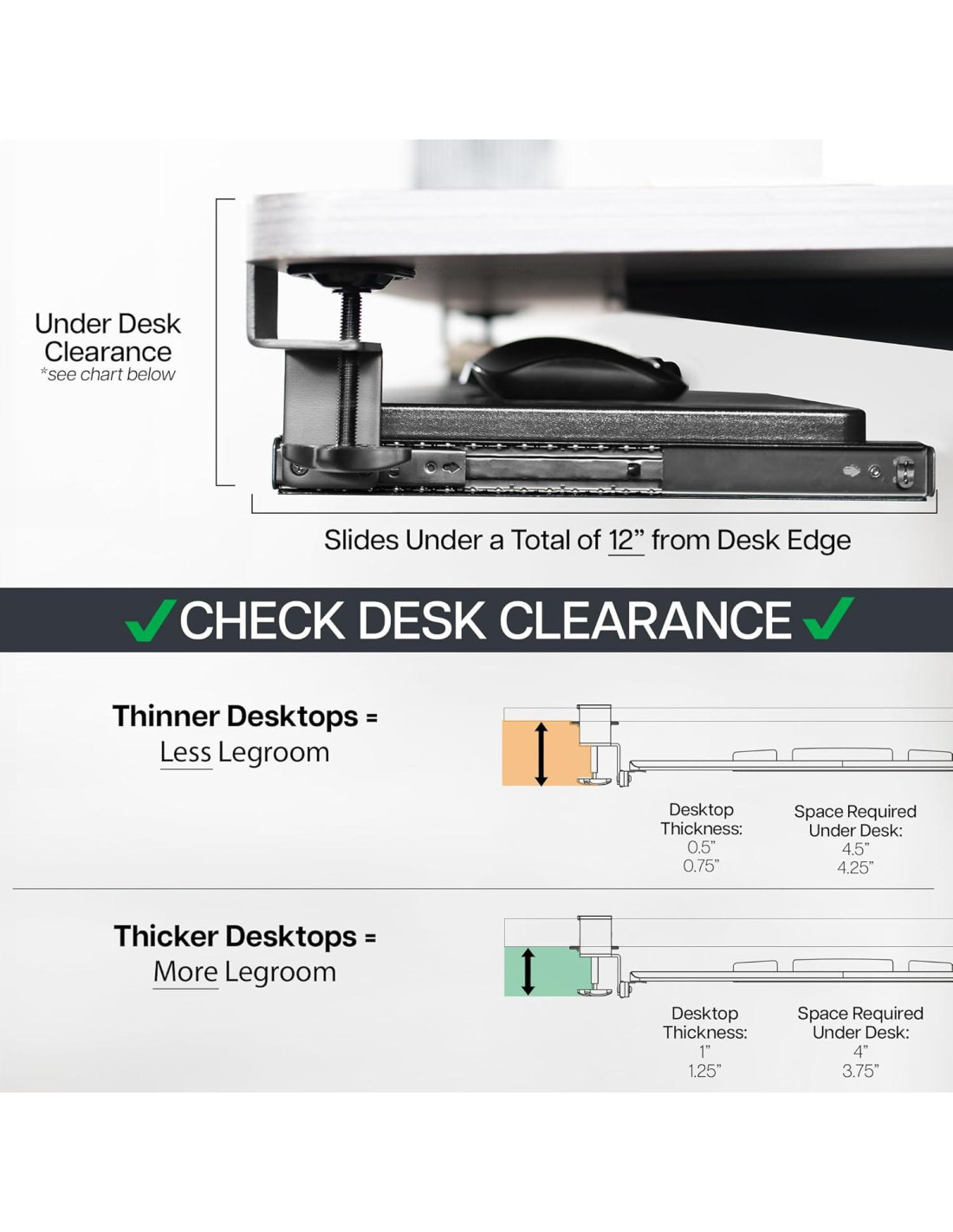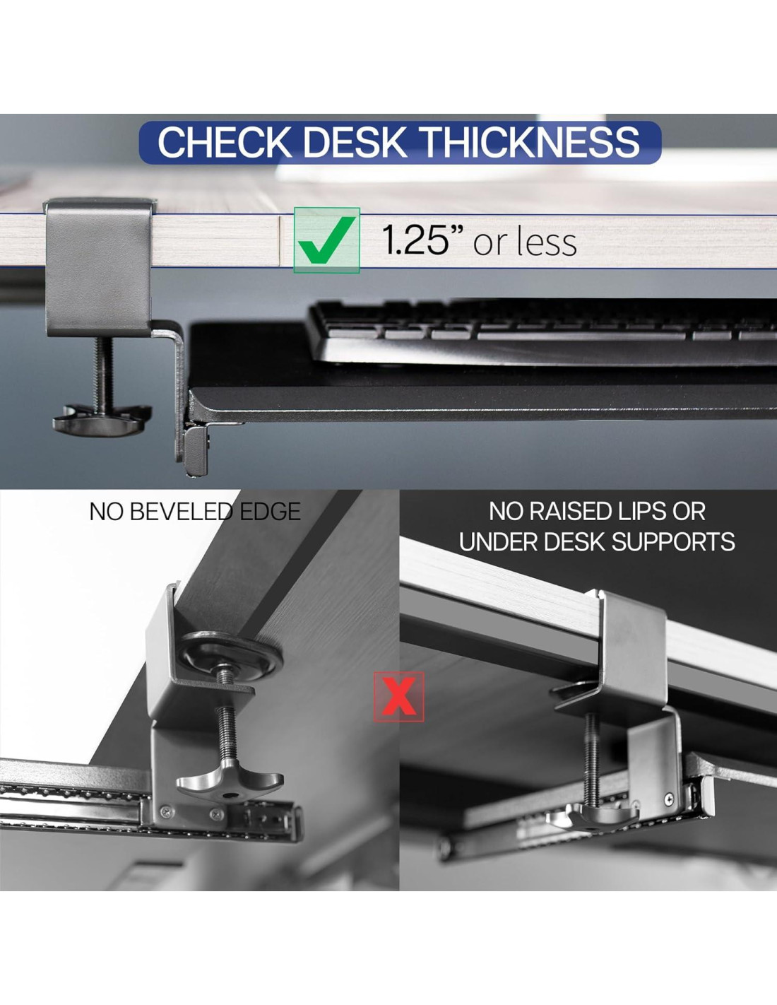 - Fácil instalación con abrazaderas en C resistentes - Adjunta la bandeja de teclado a tu estación de trabajo sin causar daños a tu escritorio (1.25" (3.18 cm) grosor máximo del escritorio) con abrazaderas en C resistentes que mantienen todo en su lugar y son fácilmente ajustables para la conveniencia del usuario. Antes de comprar, asegúrate de que la superficie de tu escritorio no exceda un grosor de 1.25" (3.18 cm).