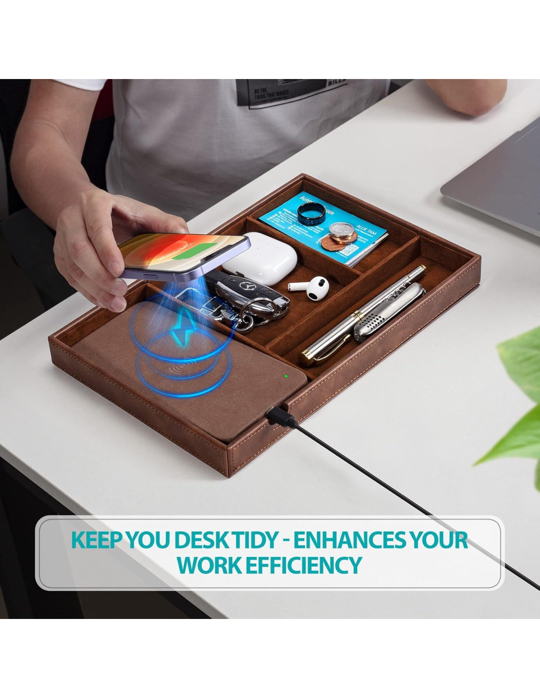 - Organizador Funcional de Mesita de Noche - Bandeja de valet para hombres diseñada con 4 compartimentos de diferentes tamaños para billetera, llaves, teléfono, dinero, joyería para hombres/mujeres y otros accesorios. Integrada con una almohadilla de carga inalámbrica desmontable, solo coloca tu teléfono en el cargador inalámbrico para cargar, ya no es necesario enchufar y desenchufar. Portátil y fácil de llevar