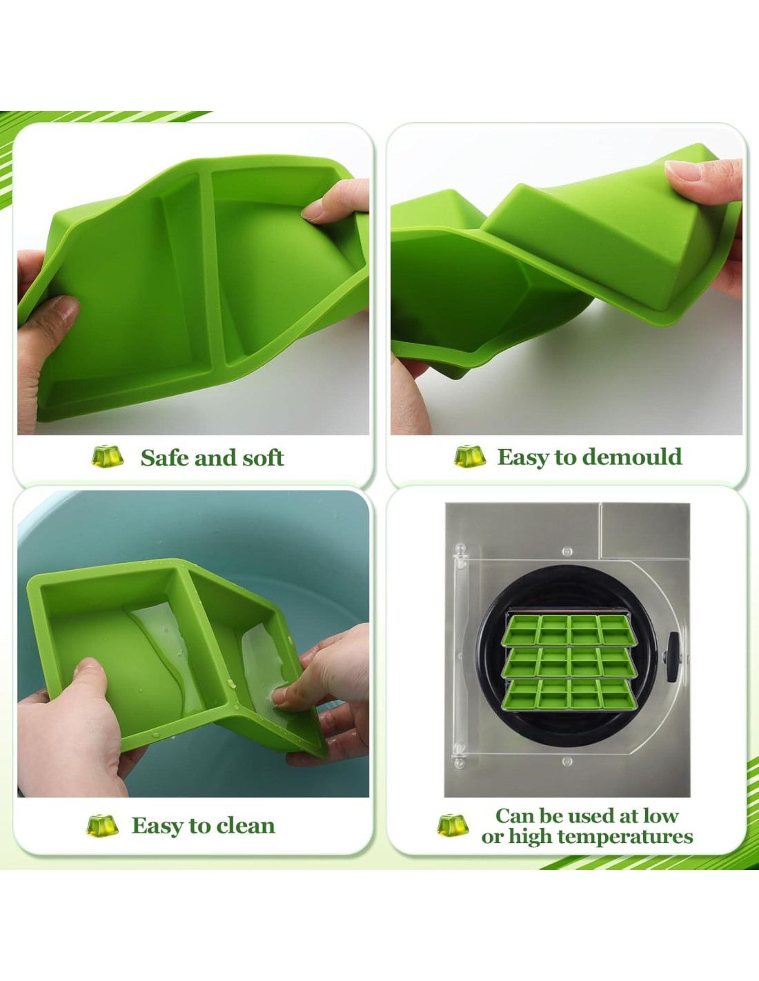 - Silicona de Grado Alimenticio: los moldes de comida de silicona están hechos de silicona de grado alimenticio, seguros para que hagas cualquier comida deliciosa como desees; que puede adaptarse a diferentes temperaturas y satisfacer tus necesidades
