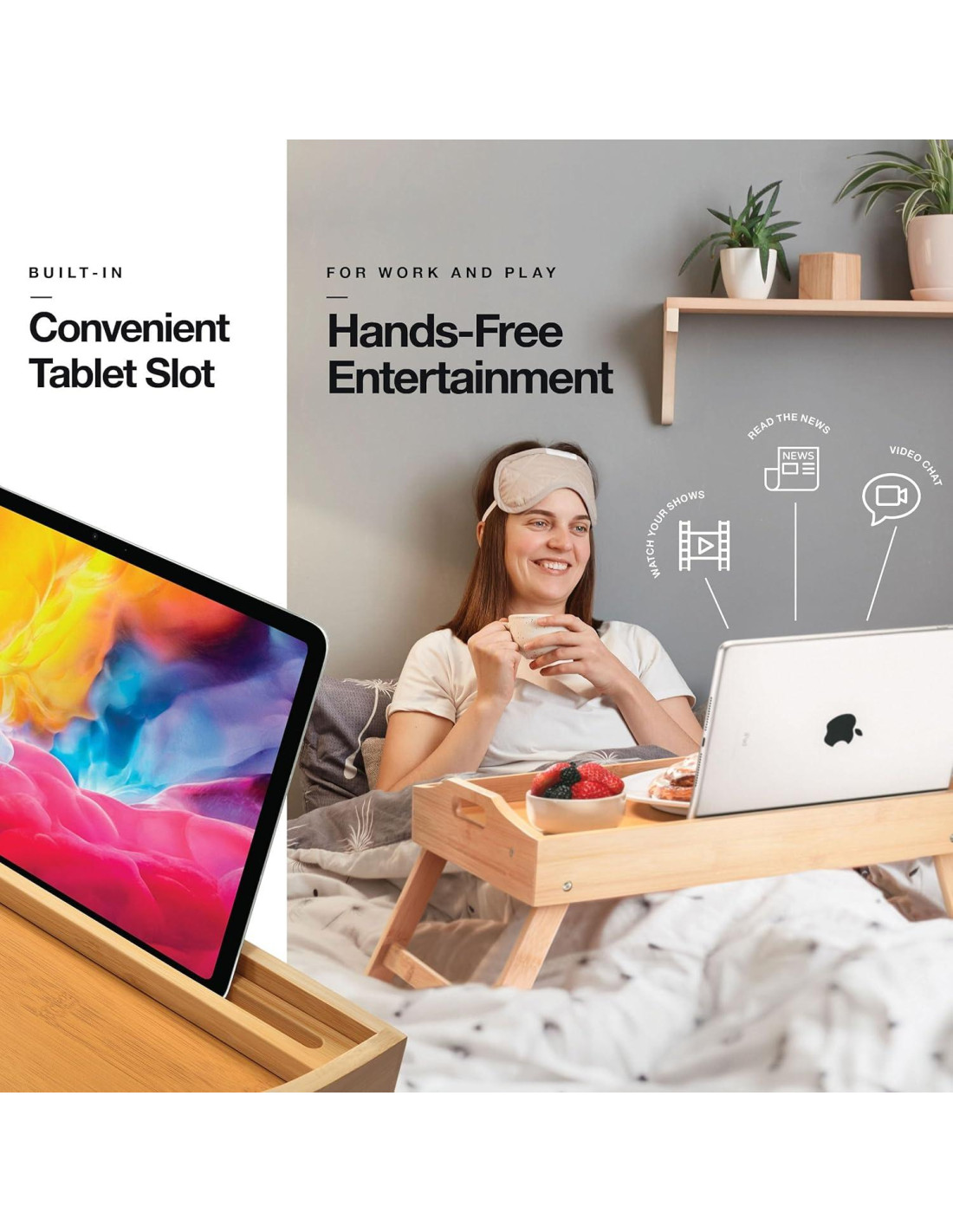 - Una bandeja de comer en la cama con un soporte para laptop o smartphone es un accesorio versátil y conveniente diseñado para la comodidad y productividad en la cama. Es perfecta para desayunos en la cama, estudiar, trabajar de forma remota o simplemente disfrutar de una noche acogedora.