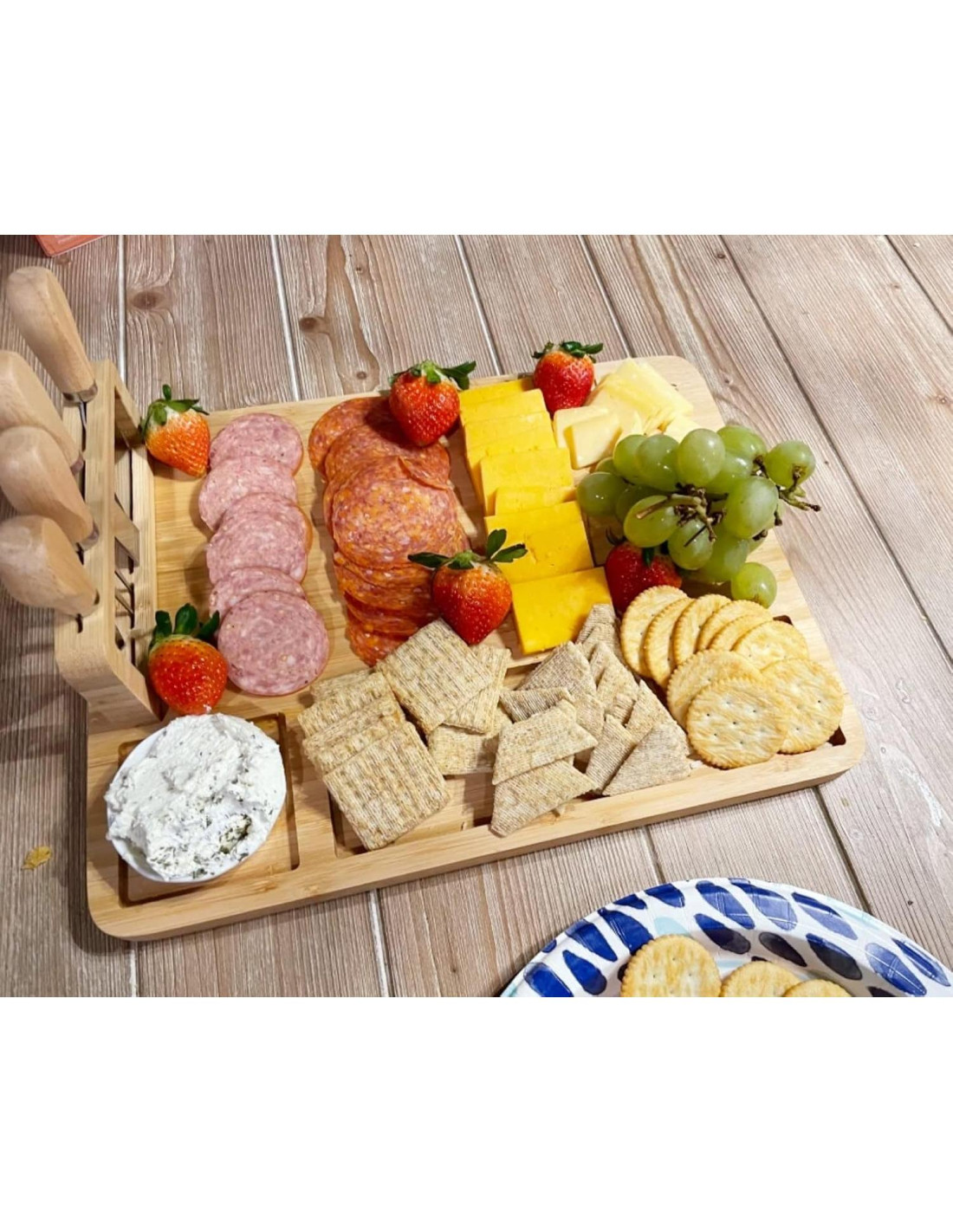 - MATERIAL DE ALTA CALIDAD - La tabla de queso está hecha de bambú natural 100%, y es gruesa y resistente para durabilidad y preservación. La superficie suave junto con los cuchillos de queso correspondientes facilita el corte de quesos variados, frutas y otros.