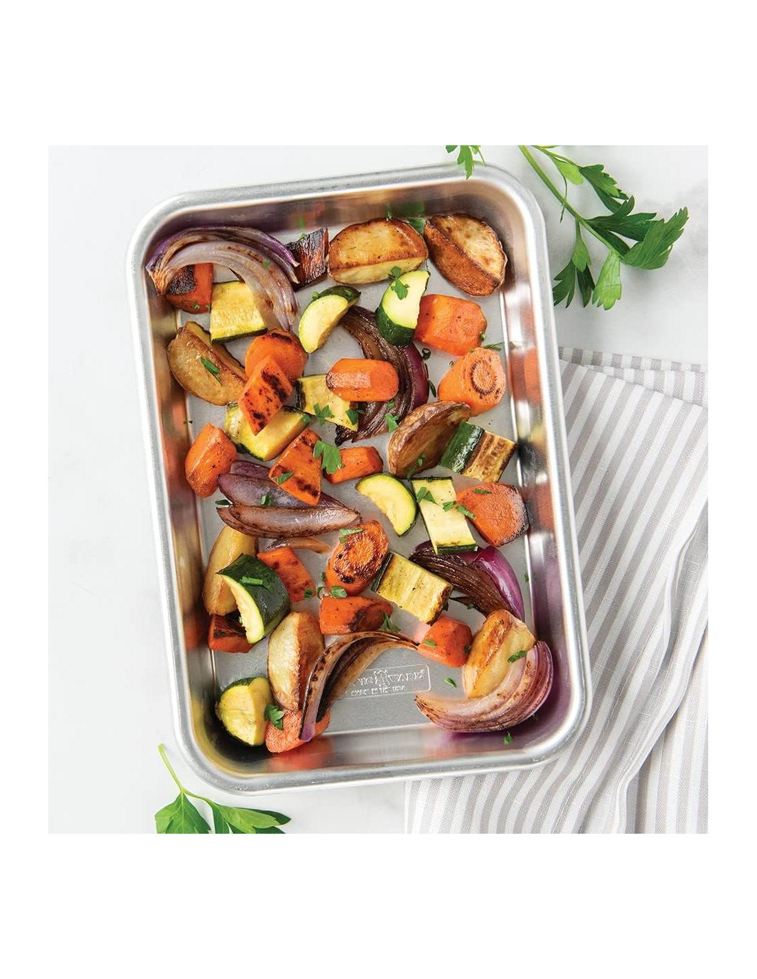 Bandeja para Pasteles Comercial de Aluminio Natural Nordic Ware con Tapa, Bandeja Rectangular con Tapa Plateada, 9 x 13 Todos necesitan una bandeja para pasteles de 9" x 13". Los chefs de repostería profesionales y las panaderías hornean en aluminio para obtener resultados consistentemente perfectos. Tú puedes hacer lo mismo con nuestra línea de utensilios de cocina de calidad comercial Naturals. Hechas de aluminio puro, estas bandejas premium nunca se oxidarán ni deformarán, y producen productos horneados dorados de manera uniforme cada vez. Viene con una tapa para mayor funcionalidad al sellar la frescura y facilitar el transporte. La tapa se ajusta alrededor de los bordes para mantener el contenido fresco. Cuando se presiona correctamente en los extremos, la tapa se ajustará sobre el borde de la bandeja. La tapa se coloca ligeramente en su lugar, es más un ajuste suelto en todas las bandejas. Orgullosamente fabricado en EE. UU. Bandeja de 1/8 de hoja Nordic Ware, 1-Pack, Aluminio Los chefs de repostería profesionales y las panaderías confían en el aluminio puro para obtener resultados consistentemente perfectos. Tú puedes hacer lo mismo con nuestra colección de utensilios de cocina de calidad comercial Naturals. Estas bandejas premium nunca se oxidarán y producen productos horneados dorados de manera uniforme cada vez. Para hornear dulces o salados de 1 a 2 porciones. Tamaño compacto que se adapta a encimeras y hornos tostadores; también es seguro para hornos convencionales. También es perfecta como bandeja de servicio para porciones individuales de hamburguesas, sándwiches y más. Dimensiones de la bandeja: medidas exteriores 25.7 x 17.8 x 2.8 cm y medidas interiores 23.9 x 16.0 x 2.8 cm. El aluminio es reactivo a ingredientes ácidos como el vinagre y productos de tomate. Estos alimentos pueden oscurecer, picar o corroer la bandeja después de un uso prolongado. Orgullosamente fabricado en América desde 1946