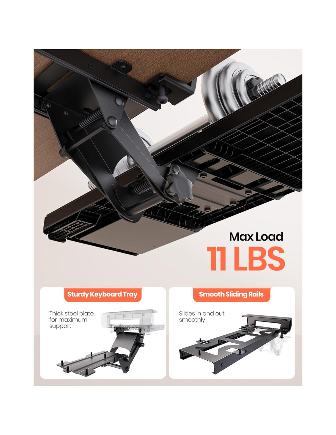 - [Fácil Instalación y Uso Estable] Fácil de instalar, esta bandeja de teclado es resistente, estable y construida para un uso duradero. Asegúrate de que tu escritorio tenga un ancho mínimo de 62.0 cm, una altura libre bajo el escritorio de más de 40.6 cm, y sin marcos en los bordes para asegurar un ajuste adecuado y un rendimiento confiable.