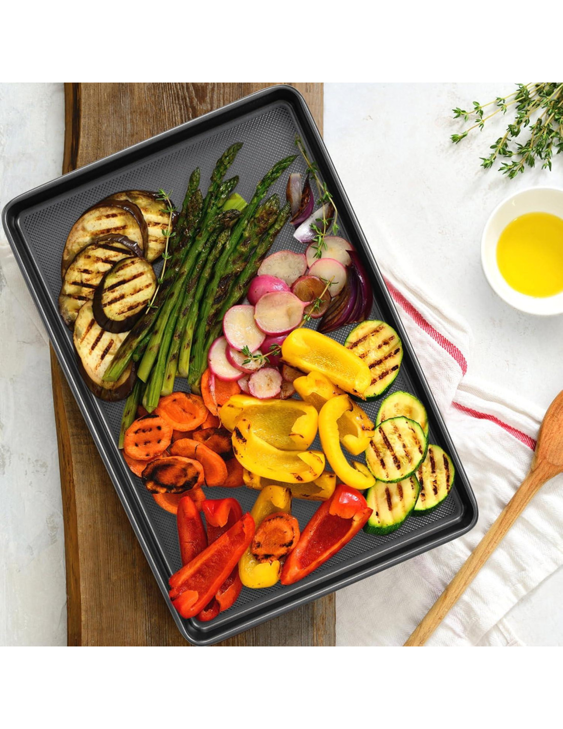 - DURADERO - Nuestras bandejas para hornear antiadherentes están hechas de acero al carbono de peso pesado, con una construcción resistente a la deformación. Nuestras bandejas para hornear tienen un grosor de 0.8MM, 2 veces más gruesas que las bandejas para hornear delgadas normales. Gracias a este grosor, nuestras bandejas para hornear proporcionan durabilidad y rápida distribución uniforme del calor para un dorado uniforme, aptas para horno hasta 232C. Estas nunca se deformarán ni doblarán.