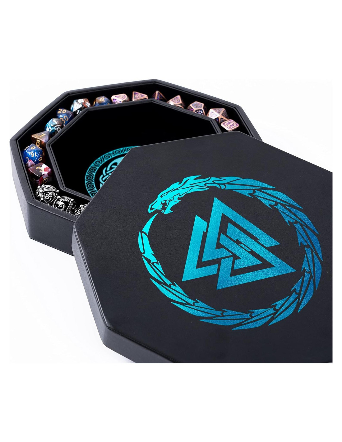 - Impresionante Detalle y Arte: Arte magistral único de Soar Forge que presenta un valknut azul o "nudo de los caídos", rodeado por un dragón ouroboros eterno en una tapa de cuero PU negro de alta calidad. El llamativo valknut se considera un símbolo del dios nórdico Odin y brilla hermosamente a la luz (Dados y accesorios NO incluidos).