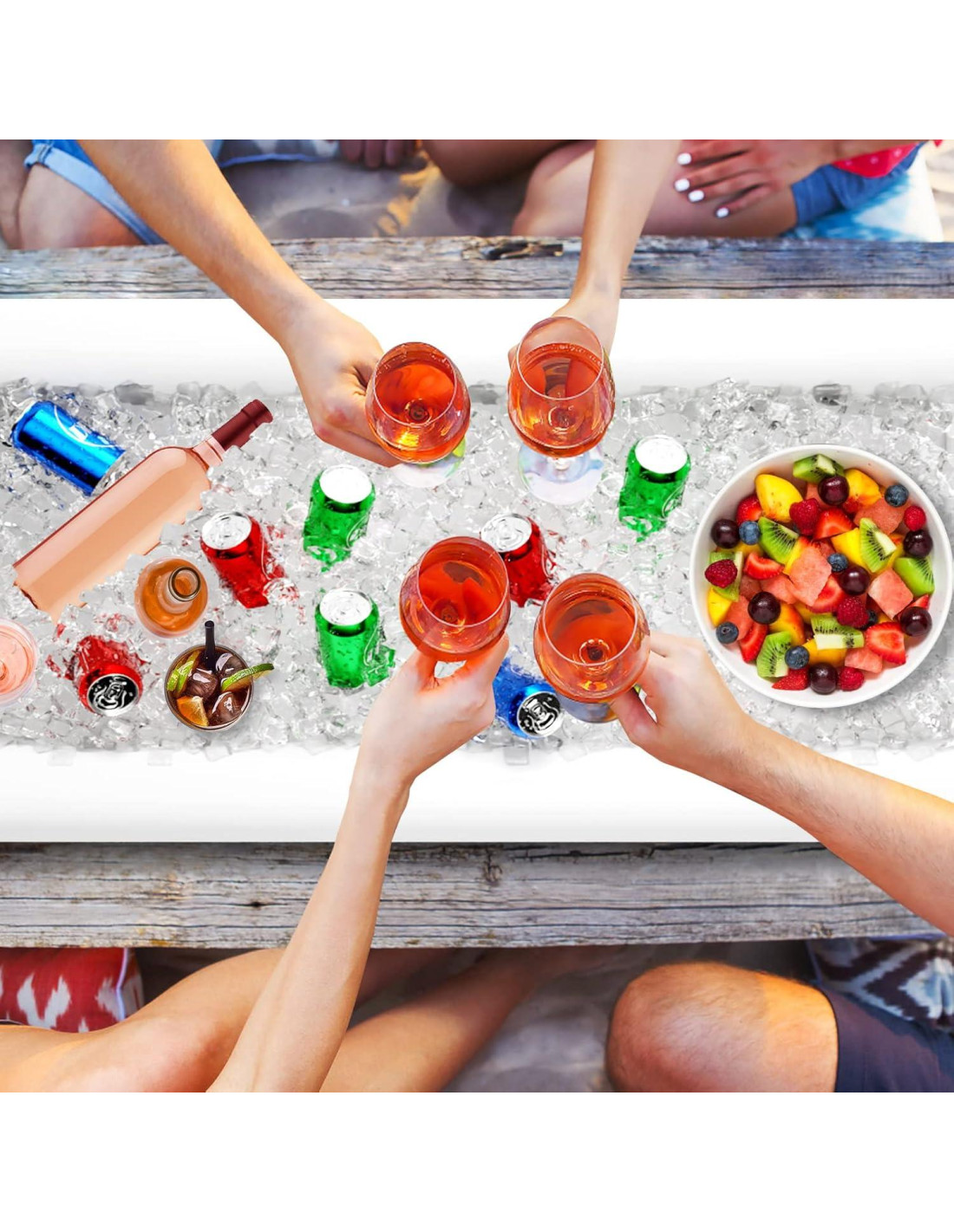 Este buffet de comida fría inflable se puede usar en interiores y exteriores. Una excelente adición a fiestas de verano, BBQ, picnics, reuniones familiares, fiestas de cumpleaños, fiestas de graduación, bodas en la playa, camping, etc. Simplemente llénalo de hielo. Mantendrá ensaladas, frutas, refrescos y todas las bebidas frías durante horas. Fácil de drenar líquidos o agua helada en segundos a través del tapón de drenaje. Fácil de almacenar para la próxima fiesta.