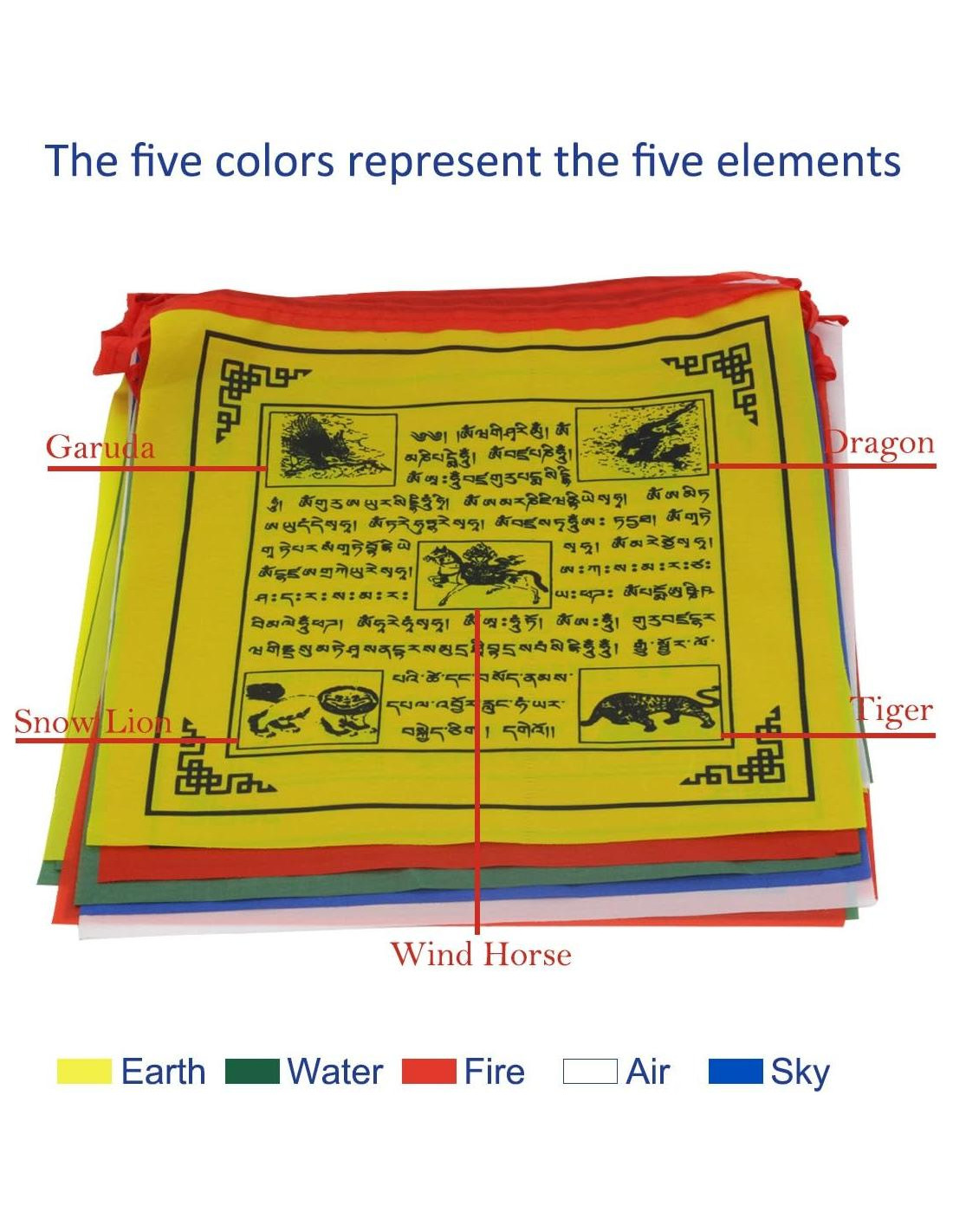 - Bandera de caballo del viento - Los cinco colores brillantes representan los elementos básicos: espacio, aire, fuego, agua y tierra. Cuando el viento sopla, emite vibraciones espirituales positivas.