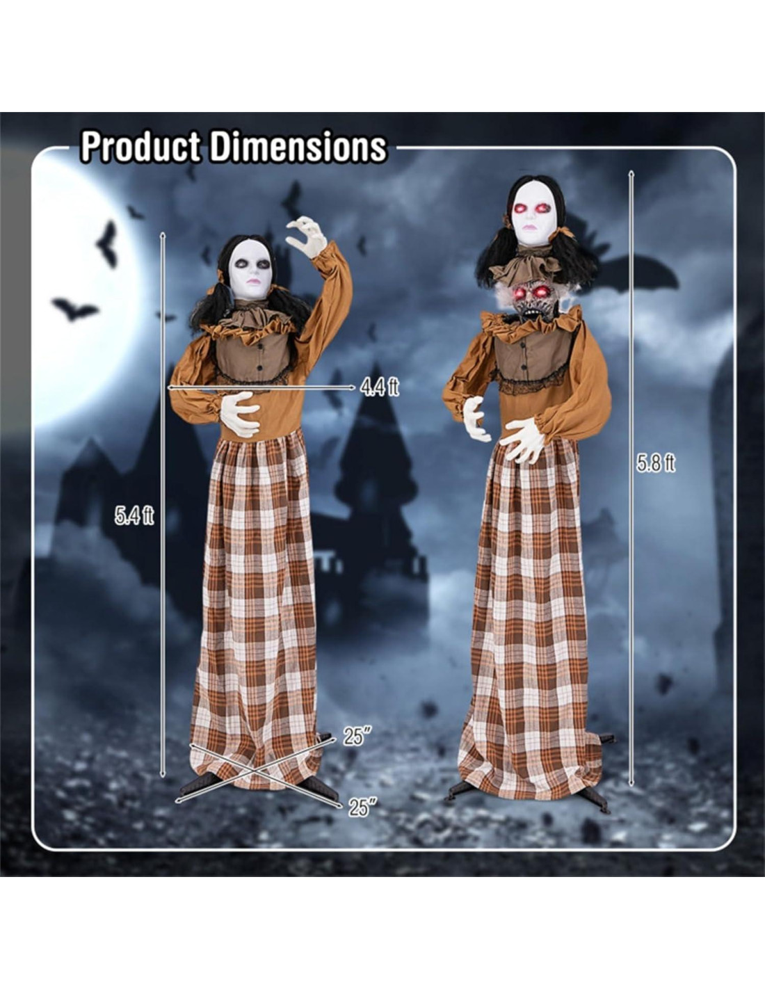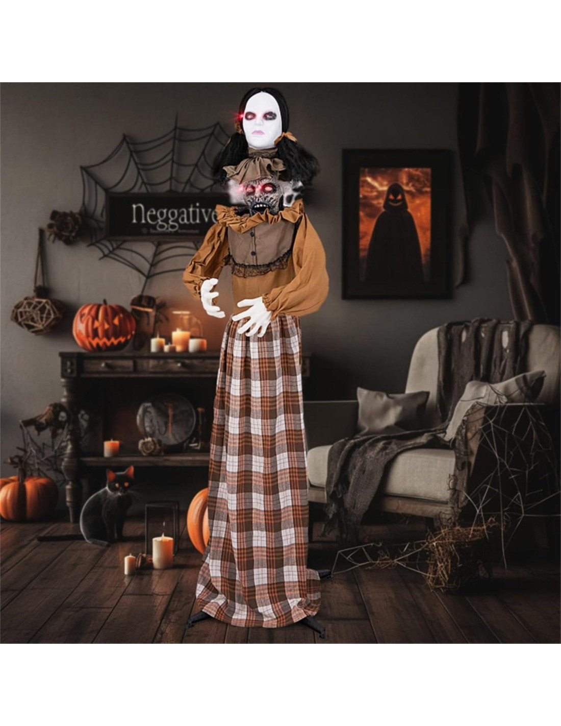 - Características Terrificantes: Esta vívida mujer animatrónica a tamaño real viene completa con un elegante vestido, brazos flexibles, manos delgadas y 4 ojos intermitentes rojos para añadir una atmósfera aterradora. Además, la risa estridente y la canción sombría la convierten en el centro de atención del miedo en su evento de Halloween.