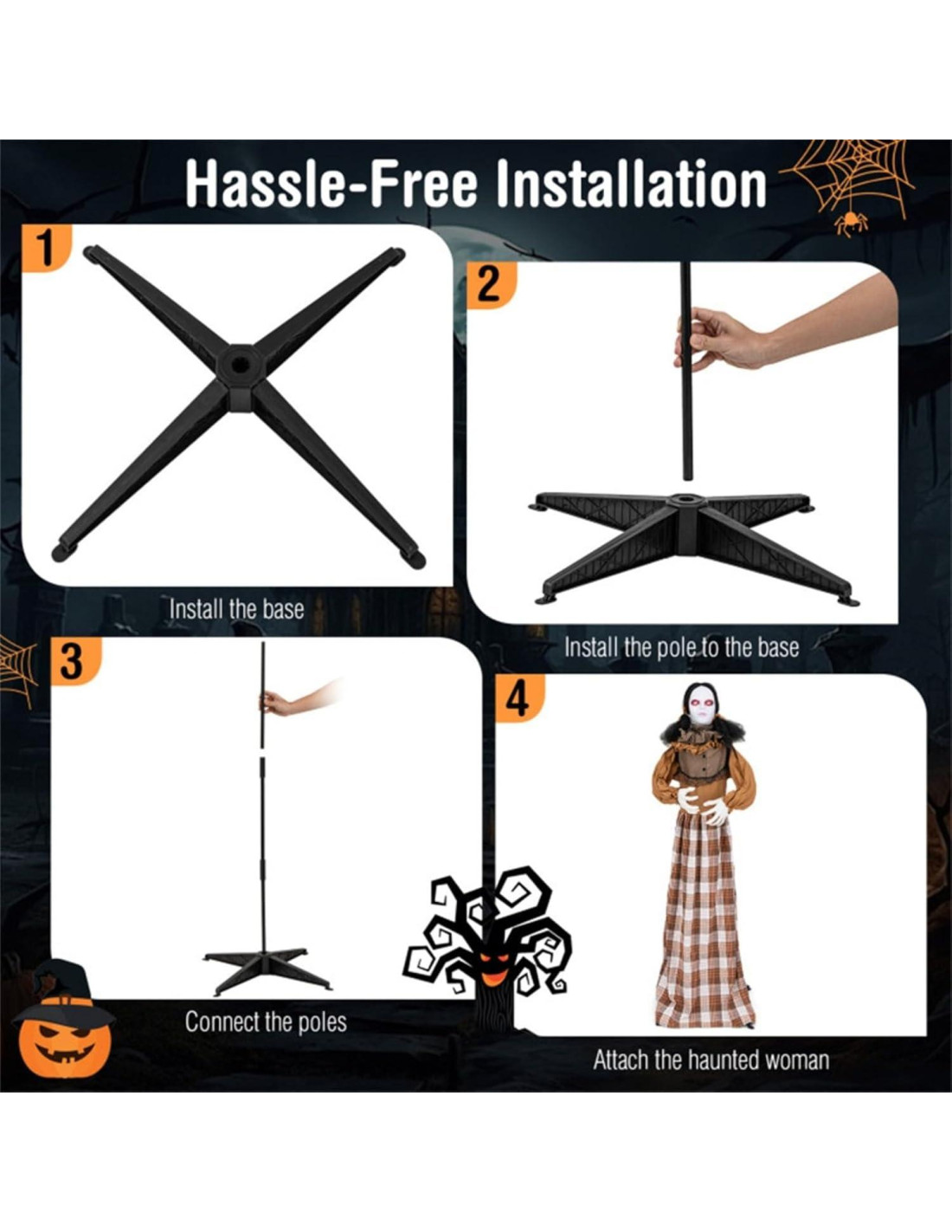- Instalación Sin Complicaciones: Configurar esta bruja espeluznante es muy fácil. Solo necesita instalar la base, instalar el poste a la base, conectar los postes y adjuntar a la mujer encantada. ¡Disfrute de un Halloween espantosamente divertido de inmediato! Especificaciones