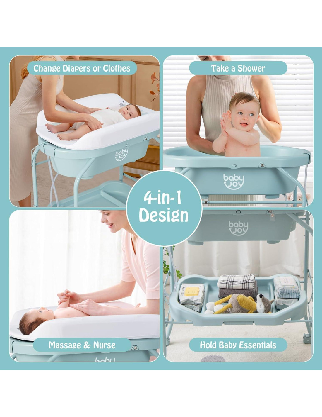 - Mesa de Cambio para Bebés 4 en 1: Esta mesa de cambio para bebés con bañera cuenta con un diseño 4 en 1 para versatilidad. Puedes usarla para cambiar pañales o ropa a tu bebé, dejar que tu bebé se bañe, masajear y alimentar a tu bebé, así como sostener los elementos esenciales del bebé. Y la altura es apropiada para que no necesites agacharte demasiado.