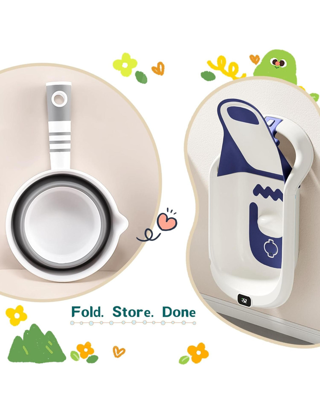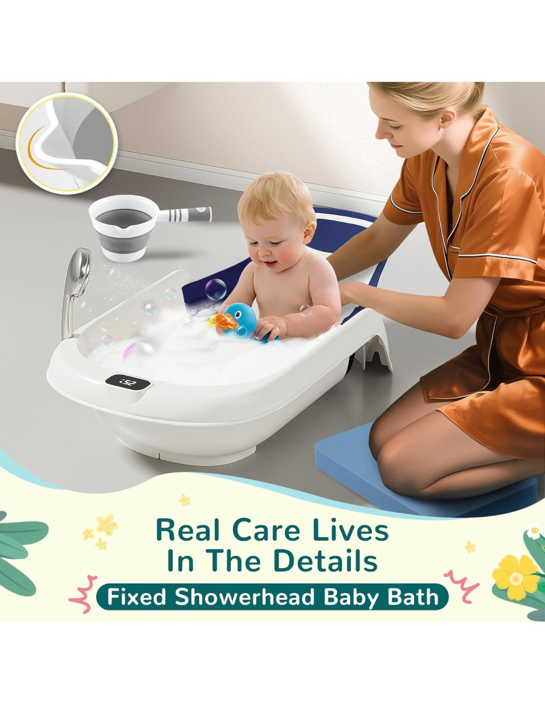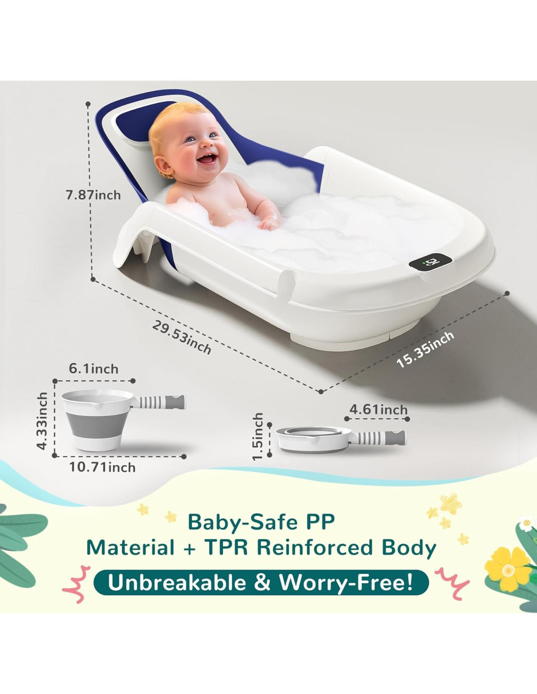 - Accesorios Amigables para Padres: Almohadilla para Arrodillarse (3.81 cm de grosor), acolcha las rodillas y previene el dolor de espalda durante sesiones de baño más largas; Cucharón de Agua Plegable, hace que el enjuague sea fácil y se almacena plano.