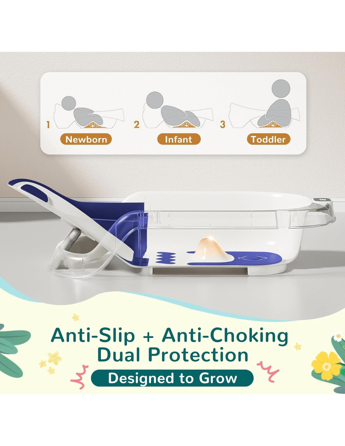 - Recién Nacido a 6 Meses: Reclinación ajustable para comodidad personalizada para recién nacidos a niños pequeños, reclinación media + almohadilla de soporte para caderas antideslizante previene deslizamientos, haciendo que la hora del baño sea estable y sin complicaciones. Aprendiendo a Sentarse (6+ Meses): Alta reclinación ofrece soporte esencial para la espalda, ayudando a los que se sientan inestables a bañarse con confianza. Modo para Niños Pequeños (12+ Meses): ¡Hay mucho espacio para la diversión en el baño con un asiento cómodo incorporado en el lado opuesto de la bañera!