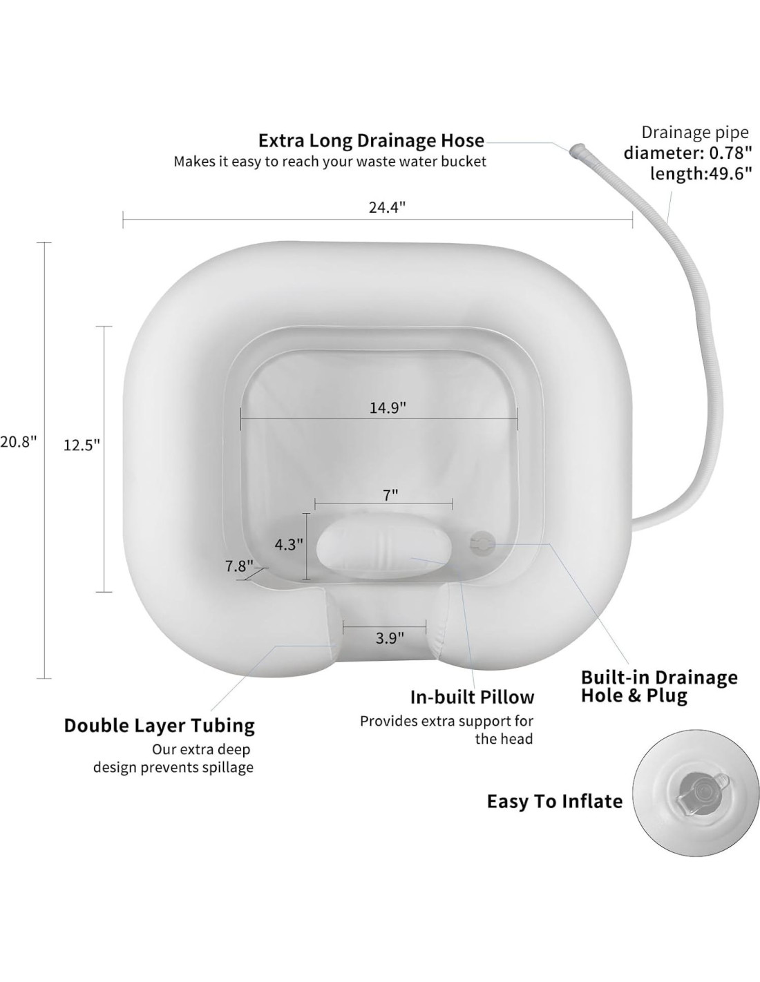 - Fácil de limpiar - El tanque de champú inflable es un accesorio esencial para el cuidado del cabello de personas con discapacidad, lavado de cabello de ancianos y higiene postoperatoria. Limpie con un paño y agua jabonosa después de su uso.
