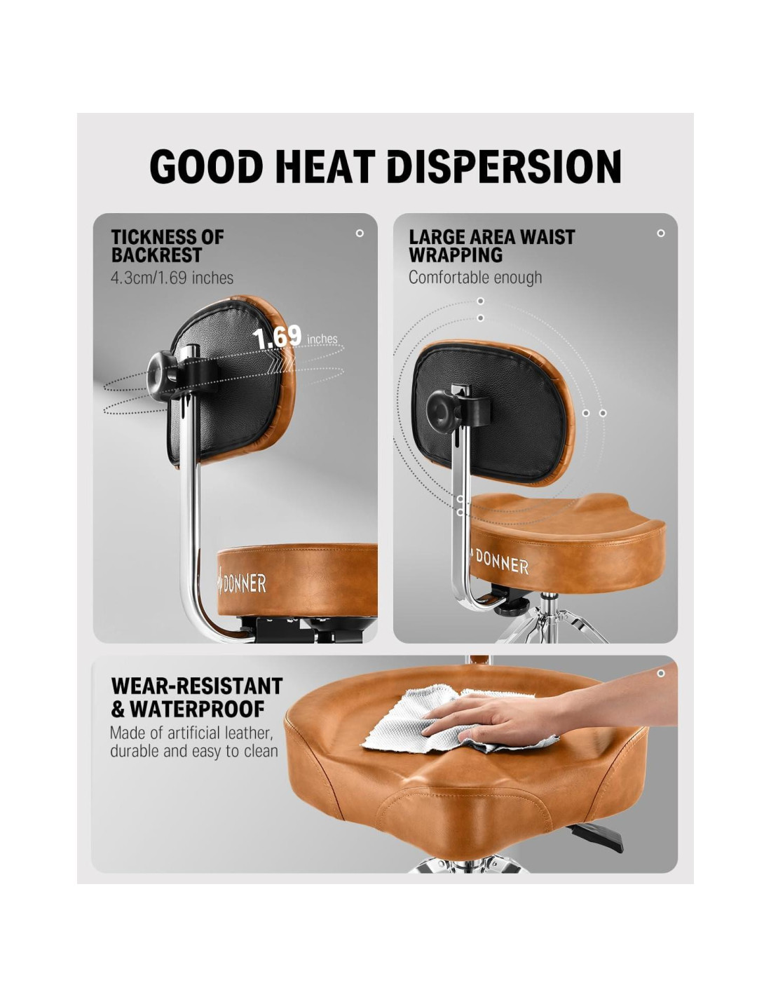 - Cojín de Asiento de Espuma con Memoria El cojín del asiento del taburete de tambor está fabricado con tela de cuero, combinado con acolchado de espuma con memoria de alta densidad, brindándote una experiencia de asiento excepcional y comodidad durante largas sesiones de práctica