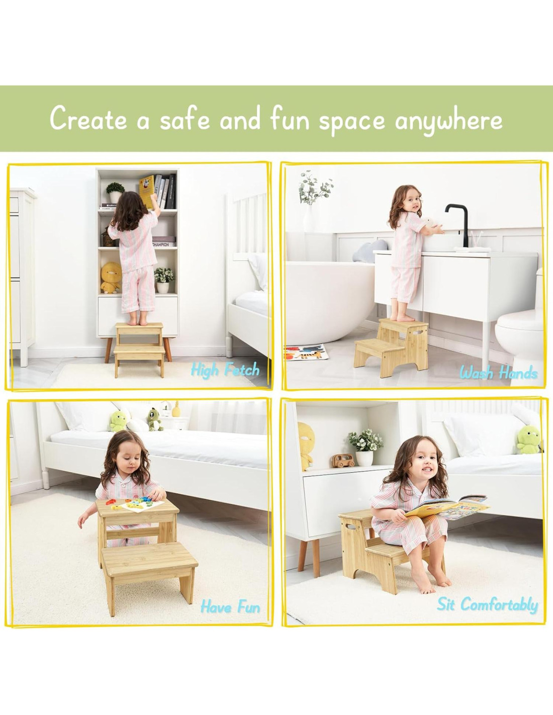 - [Mejor Asistencia para Niños] El taburete de dos pasos para niños proporciona la mejor asistencia para su hijo en crecimiento. Pueden usarlo desde el entrenamiento para ir al baño hasta alcanzar el lavabo del baño para cepillarse los dientes o lavarse las manos, tocar el piano mientras sostienen los pies de los niños, sentarse a leer libros en la guardería, y prácticamente en cualquier lugar que necesite un pequeño impulso para alcanzar.