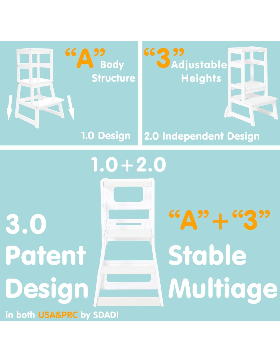 - Diseño Creciente: La escalera presenta un diseño creciente adecuado para niños de 18 meses a 3 años. La plataforma ajustable soporta hasta 90.7 kilogramos, asegurando que siga siendo un compañero confiable a medida que los niños crecen y ganan independencia.