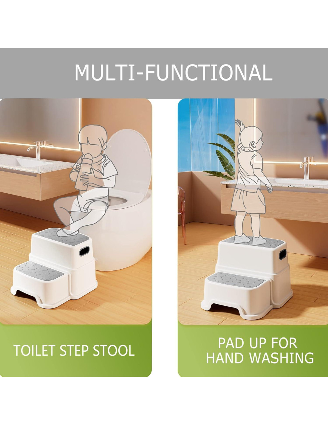- Fácil de Limpiar y Útil: El escalón para baño HOMKO para niños pequeños está hecho de material ecológico, fácil de limpiar y bastante útil, proporciona beneficios que cambian la vida para sus hijos. El escalón para niños de doble altura con escalones anchos ayuda a sus hijos a ser independientes en el entrenamiento de baño, cepillarse los dientes y lavarse las manos en el lavabo, alcanzar el mostrador de la cocina y los armarios, etc.