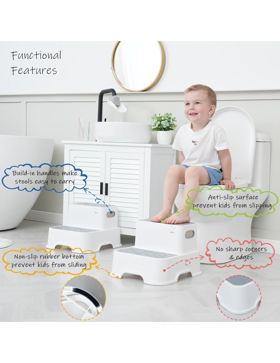 - Mejor Asistencia para Niños Pequeños La escalera de 2 pasos para niños pequeños (juego de 2) proporciona la mejor asistencia para tus niños pequeños en crecimiento. Puedes usar una para el entrenamiento en el inodoro y usar otra para alcanzar el lavabo del baño, cepillarse los dientes o lavarse las manos, tocar el piano sosteniendo los pies de los niños, y también sentarse a leer libros en la guardería, y en casi cualquier otro lugar que necesite un pequeño impulso para alcanzar por sí mismos.
