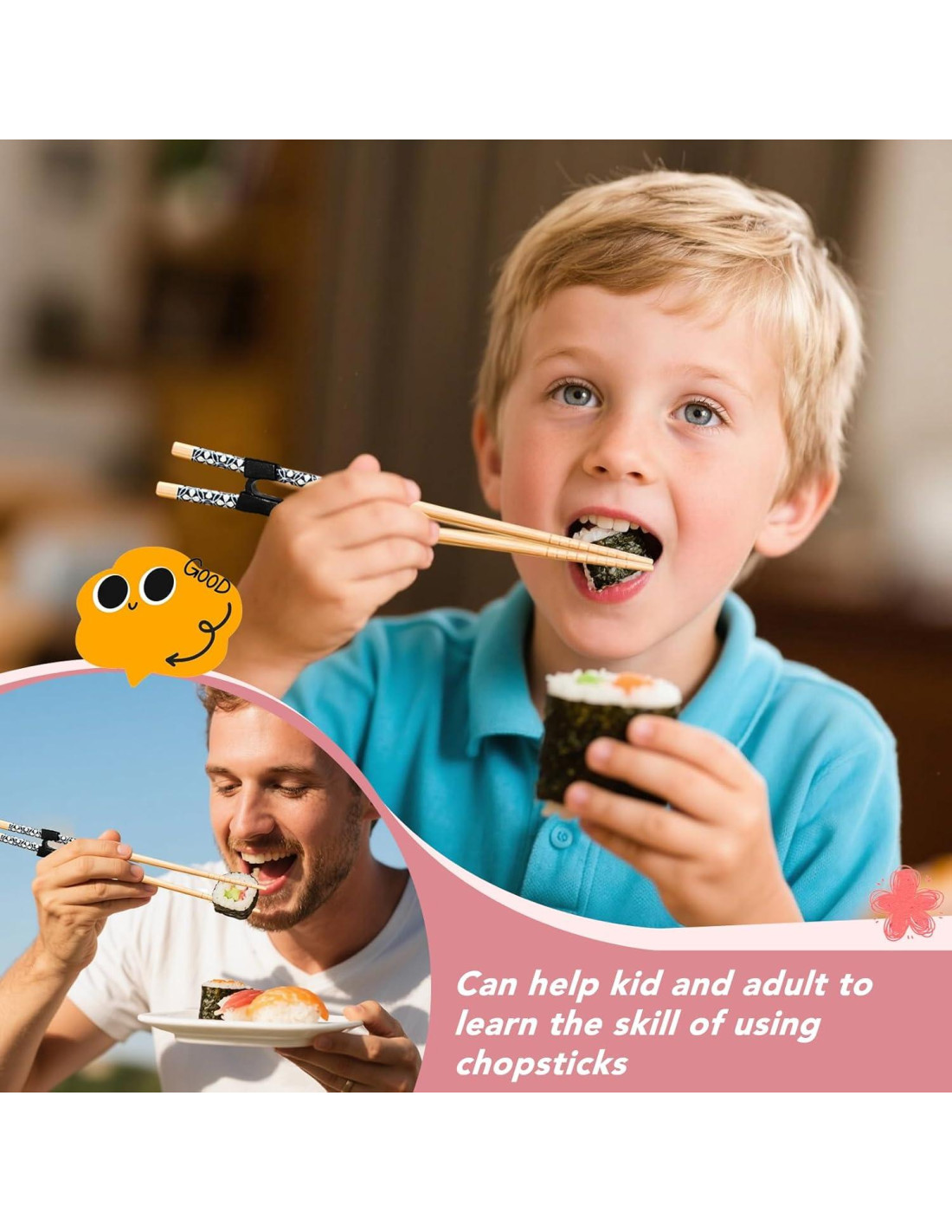 - El paquete incluye: 5 Pares de palillos de entrenamiento reutilizables para niños o adultos, 5 piezas de ayudantes de palillos de plástico, satisfacen las necesidades diarias de toda tu familia para aprender a usar palillos
