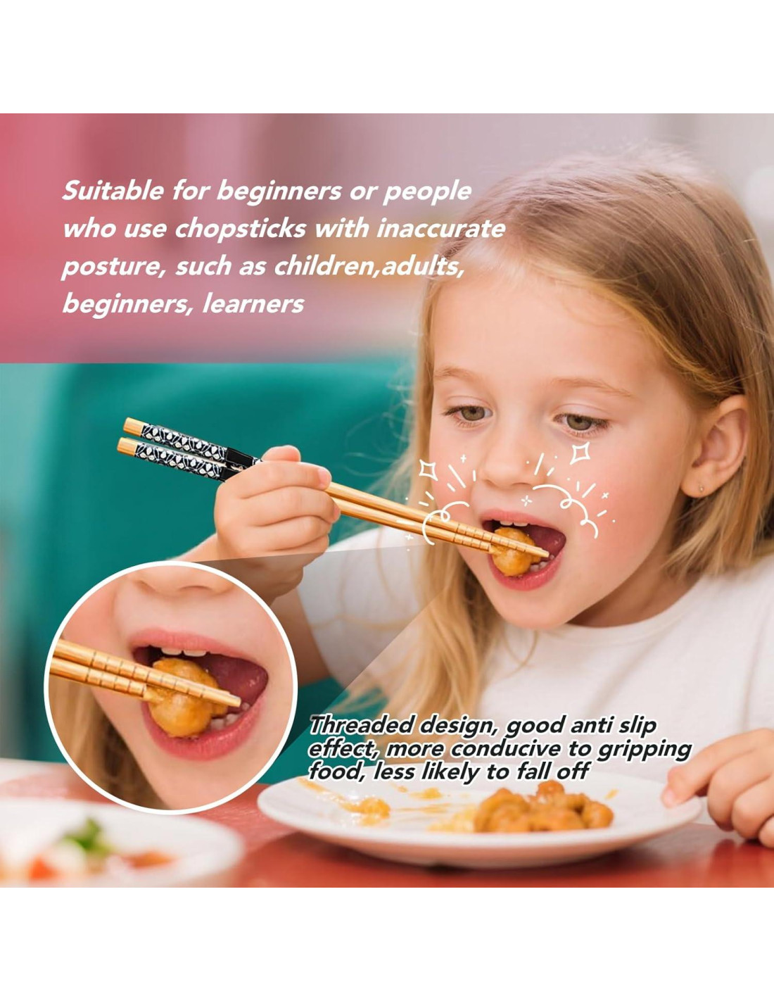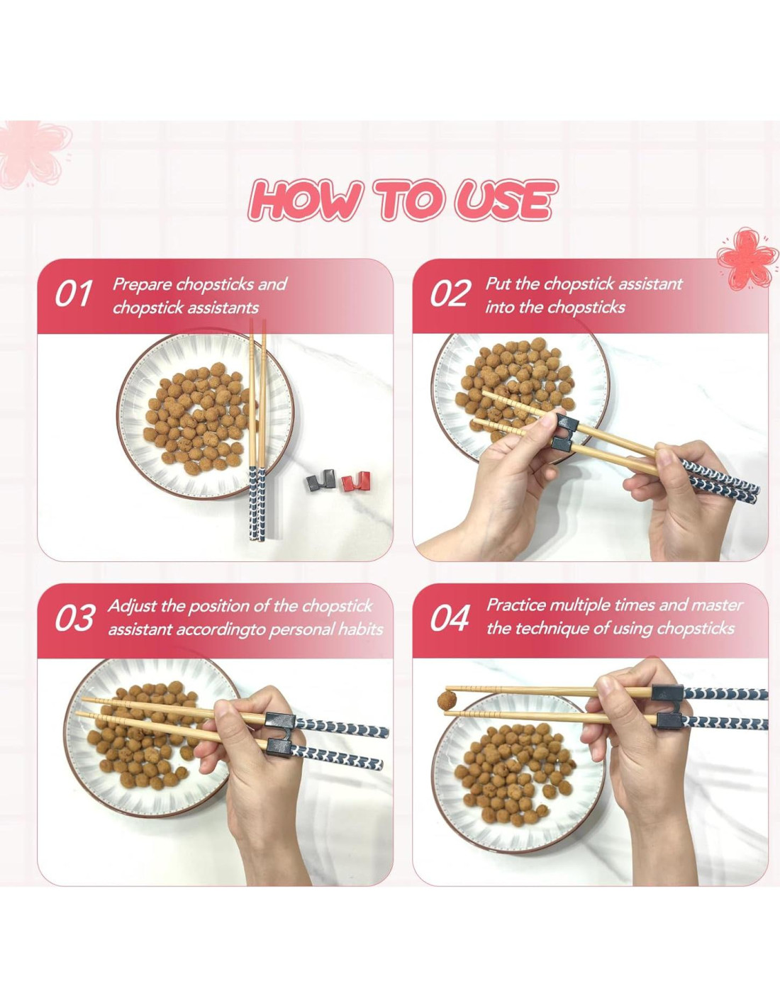 - Fácil de aprender y entrenar: Según el diagrama de operación, ajusta la altura del ayudante de palillos de acuerdo a los hábitos personales, puedes usar los palillos fácilmente para recoger alimentos como sushi, fideos, arroz, dumplings, hot pot. Puedes adquirir las habilidades para usar palillos y construir confianza al mismo tiempo.