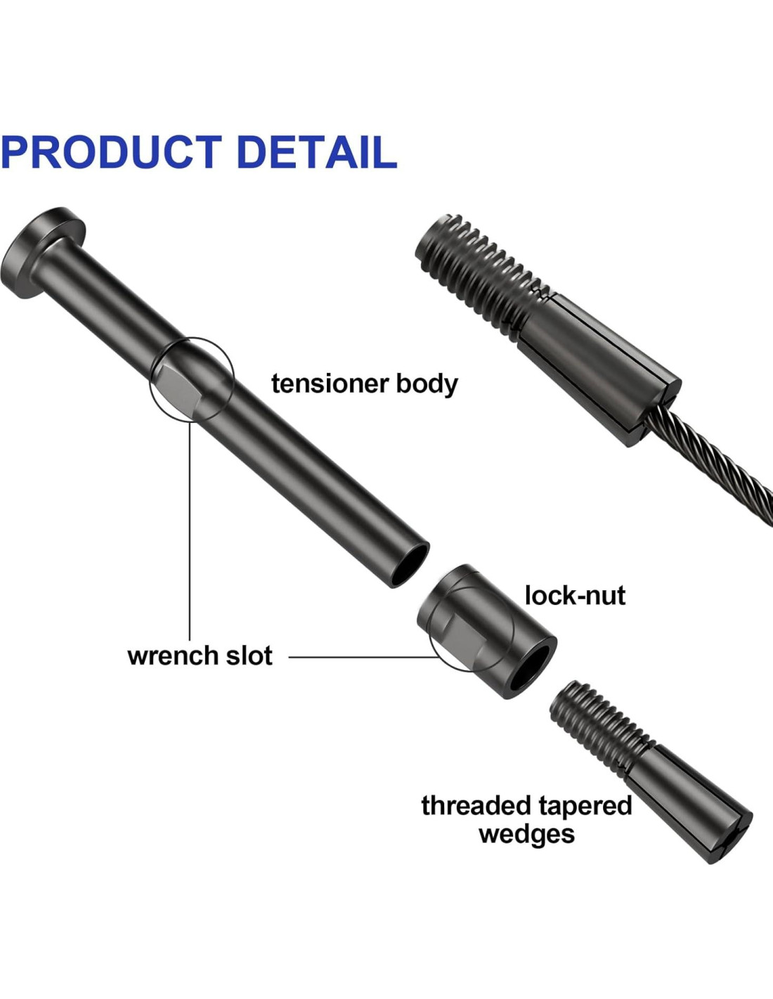 - [Diseño Sin Swageless] (Patente Pendiente) Este innovador tensador de cable sin swageless consta de solo tres componentes: un cuerpo de tensador, una tuerca de bloqueo y cuatro cuñas cónicas roscadas con dientes de sujeción internos para un engaste seguro del cable. Diseñado para la eficiencia, el dispositivo ahorra tiempo y mano de obra mientras es reutilizable, eficiente en energía y respetuoso con el medio ambiente.