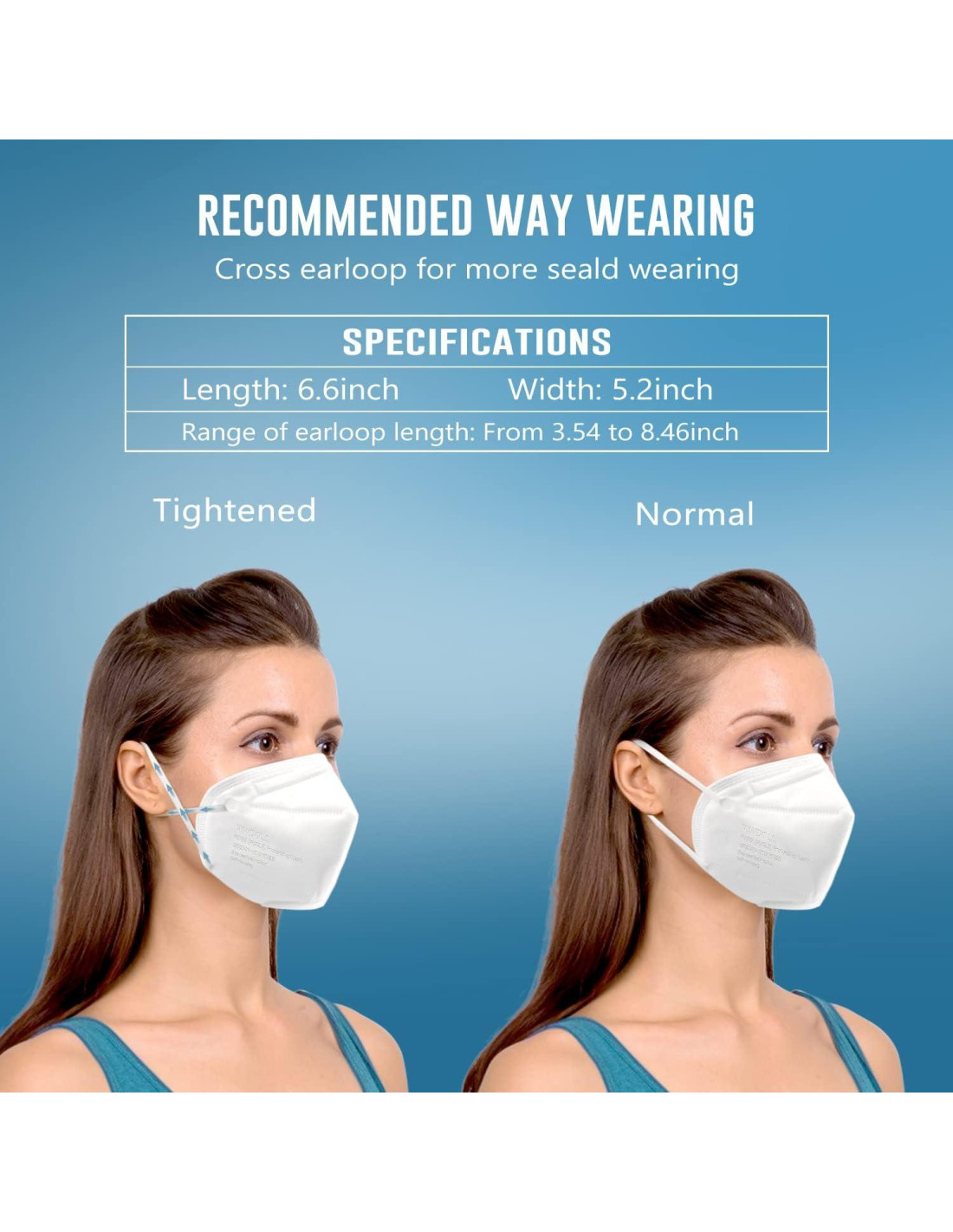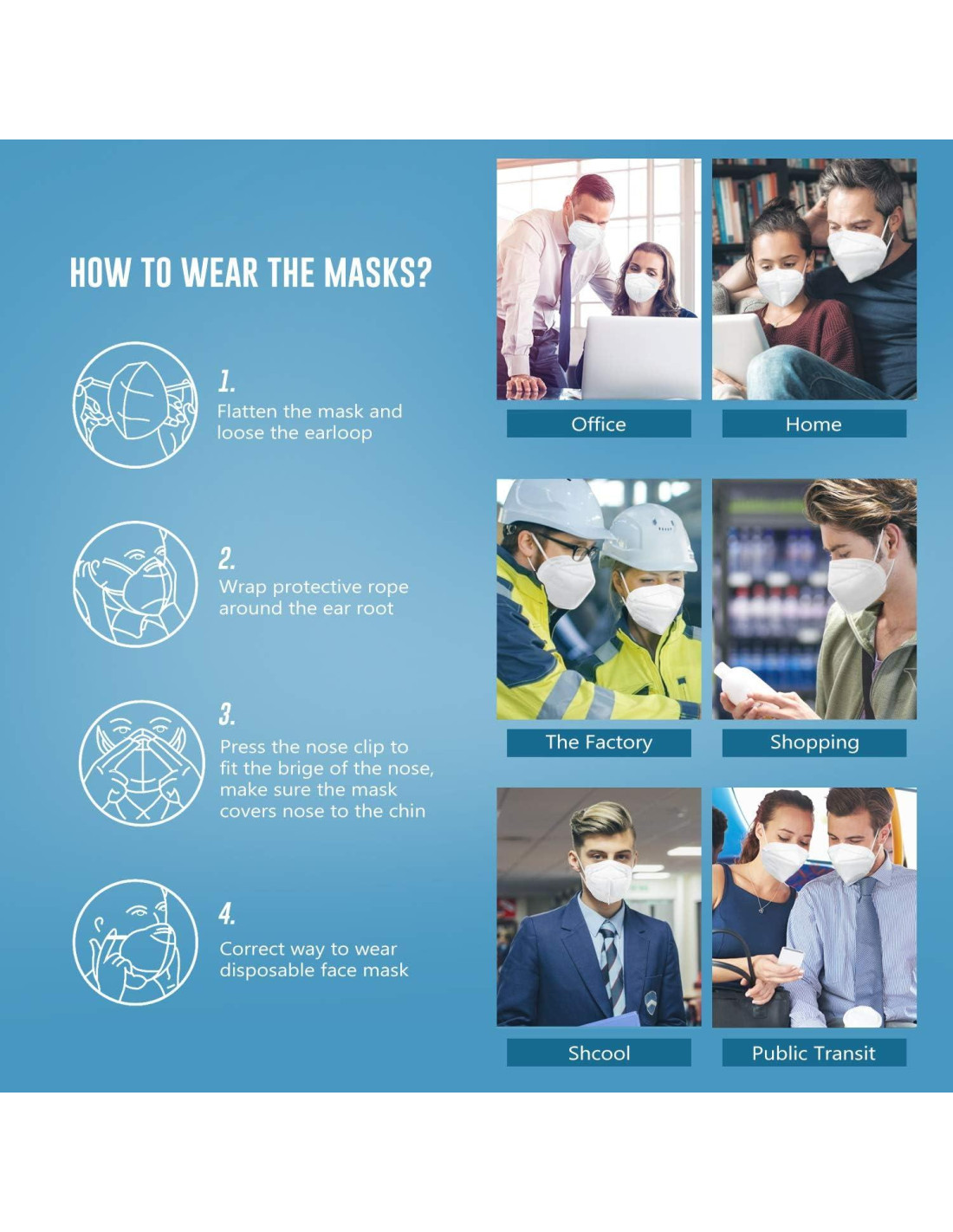 - Barrera Protectora Poderosa: No es fácil que se caiga, no necesitas ajustarla cuando trabajas. El diseño de bucle elástico más suave de la mascarilla KN95 ayuda a eliminar la presión en las orejas para una experiencia cómoda. El diseño del clip nasal ajustable puede ayudar a que la mascarilla se ajuste perfectamente a tu rostro. Los cuatro lados se unen firmemente al rostro; por lo tanto, la mascarilla protectora KN95 evita que el aire sin filtrar entre directamente.