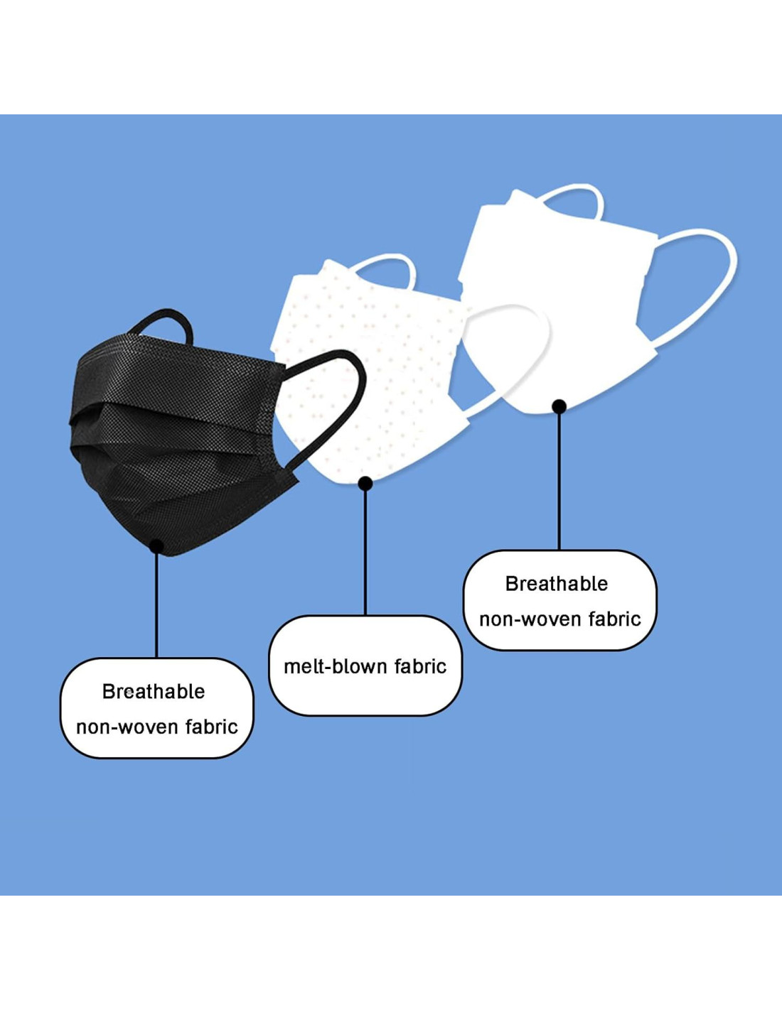 - Hechas de material no tejido de alta calidad, las mascarillas desechables protectoras son amigables con la piel, tienen un efecto de filtrado más fuerte y son más transpirables.