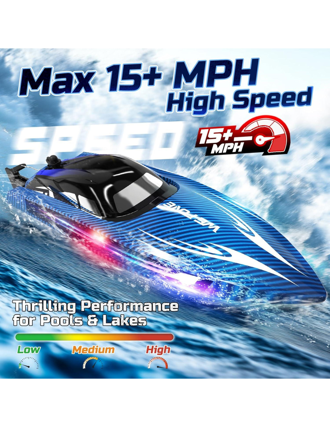 - Rendimiento de Alta Velocidad con Modos Ajustables Alcance velocidades emocionantes de hasta 24.14 KMH con este barco RC, que cuenta con 3 configuraciones de velocidad (Baja/Media/Alta) para diferentes niveles de habilidad. Perfecto para carreras y diversión en piscinas o lagos. El barco de velocidad utiliza un potente motor de 180 y está equipado con un sistema de refrigeración interna, extendiendo efectivamente la vida del motor.