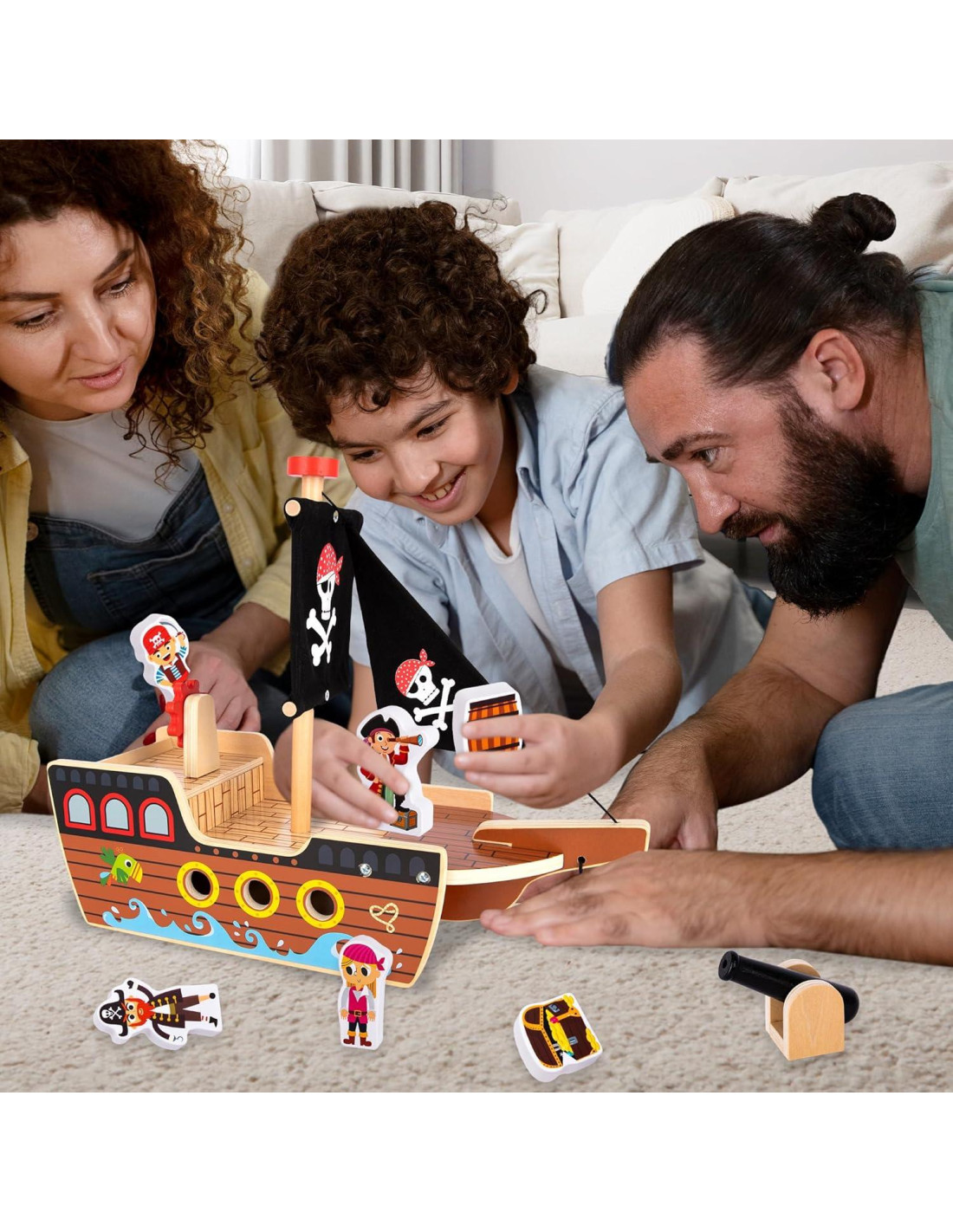 - ENCIENDE SU IMAGINACIÓN: ¡Un set de juego que combate el aburrimiento del que los pequeños bucaneros no se cansarán! Viene con un barco pirata de juguete de madera y una variedad de juguetes piratas en 2D, incluyendo un cañón, barril, cofre del tesoro, banco y 4 piratas.