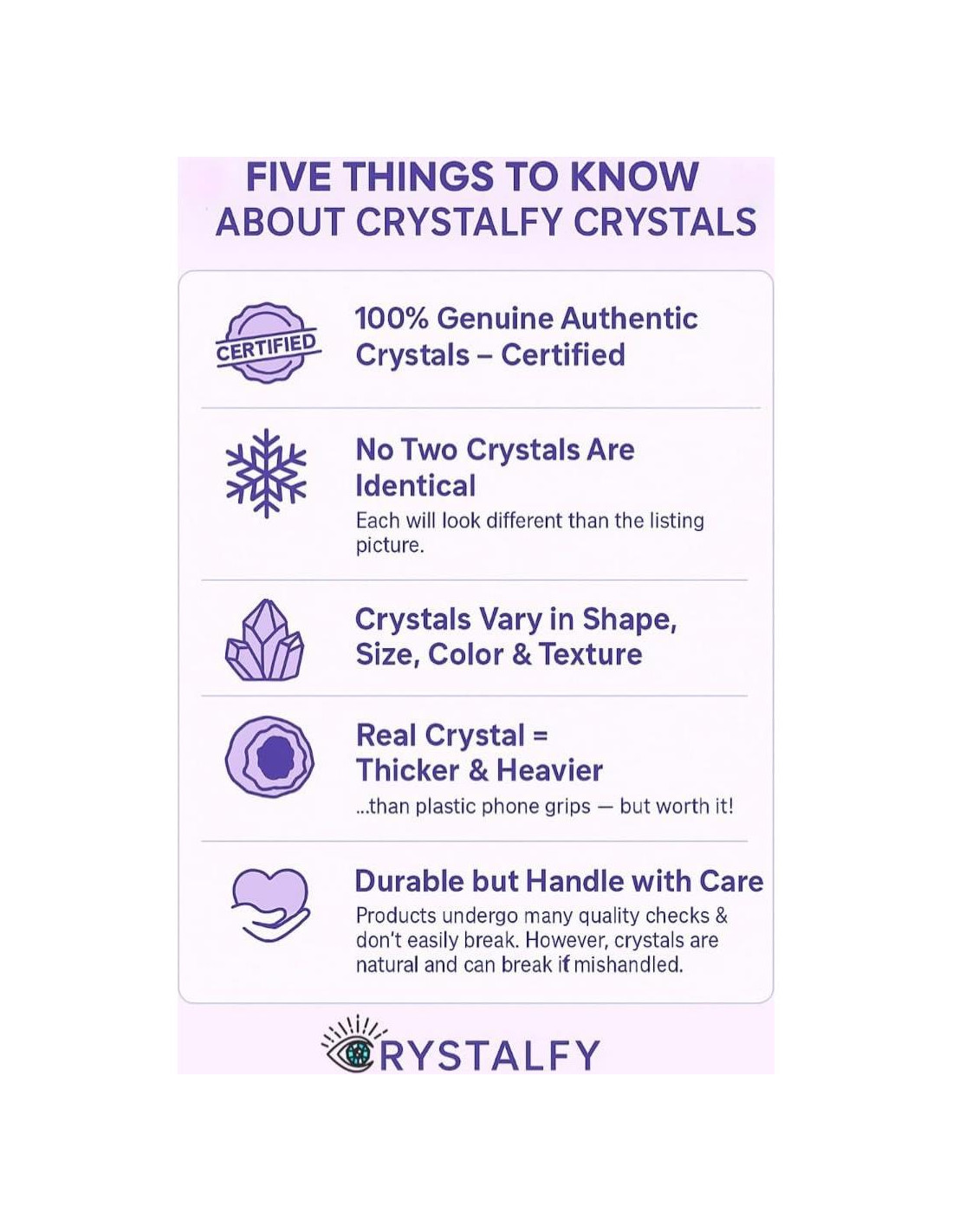 - CRISTALES REALES SELECCIONADOS A MANO - SIN FOTOS DE STOCK Cada agarre de teléfono CRYSTALFY presenta una piedra preciosa genuina, obtenida éticamente - nunca resina o imitación. Lo que ves es lo que obtienes: nuestras fotos muestran cristales reales, seleccionados a mano por su belleza, energía y singularidad.
