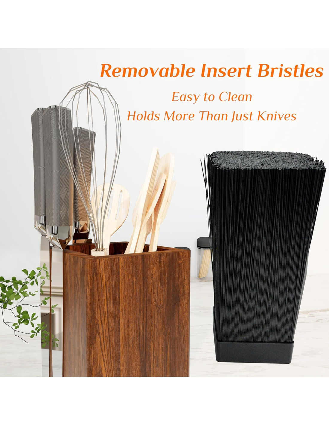 - Cerdas removibles de grado alimenticio: el bloque de cuchillos universal tiene un cartucho de cerdas flexibles incorporado que se puede quitar y limpiar fácilmente en el lavavajillas, asegurando una preparación de alimentos higiénica. El cepillo removible no astillará ni afilará sus cuchillos, permitiendo cortes precisos y sin esfuerzo cada vez.