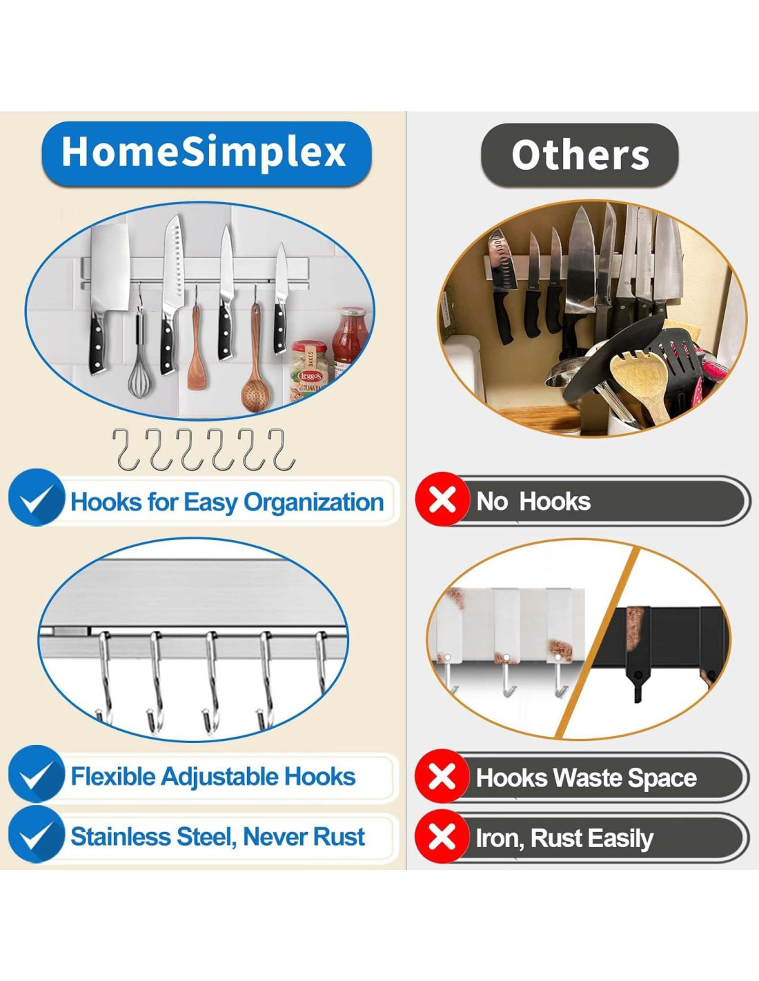 - Almacenamiento Multifuncional de 30 cm con 6 Ganchos Nuestro soporte magnético para cuchillos de cocina de 30 cm mejorado sostiene cuchillos e incluye 6 ganchos de acero inoxidable dedicados. Esta tira de soporte magnético elimina el desorden al almacenar cuchillos, herramientas y utensilios