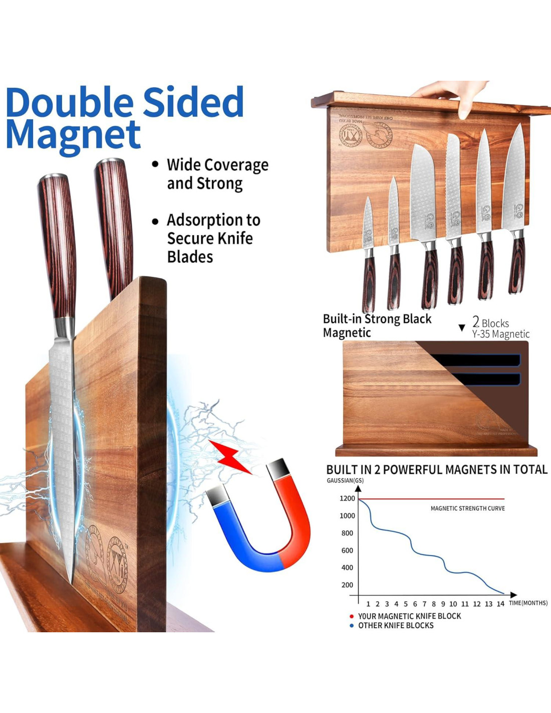 - Alta Calidad - Este soporte magnético para cuchillos está hecho de material de madera natural, resistente, duradero y ecológico, creando una cocina verde y saludable para su hogar. Nuestro bloque de cuchillos universal puede almacenar todo tipo de cuchillos de chef de acero inoxidable.