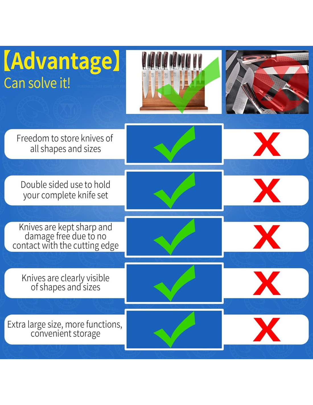- Conveniente y Práctico - A diferencia de una tira magnética para cuchillos o una barra magnética para cuchillos, este bloque de cuchillos no daña sus paredes ni encimeras de cocina. Este bloque magnético para cuchillos está listo para usar directamente de la caja sin la molestia de perforar agujeros o ensamblar.