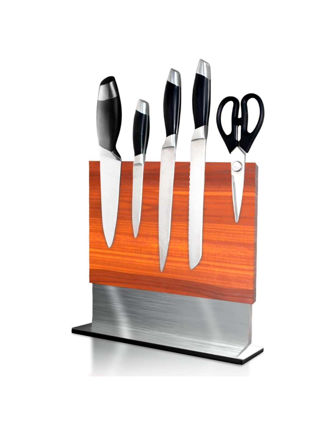 Fuerza y Estilo en Madera de Acacia Con una construcción robusta de madera de acacia y una base de acero, este bloque para cuchillos combina durabilidad con un diseño moderno que realza cualquier cocina. Además de ser fácil de limpiar, su naturaleza completamente sostenible lo convierte en una opción ecológica y consciente del medio ambiente. Es una elección segura para el uso diario en la cocina, ofreciendo durabilidad y elegancia sin sacrificar el estilo. Magnetismo Oculto de Alta Potencia Este soporte magnético para cuchillos está diseñado con imanes ocultos de alta potencia que aseguran que tus cuchillos y utensilios de metal se mantengan firmemente en su lugar. Equipado con cuatro imanes fuertes, proporciona el agarre necesario para mantener tus herramientas organizadas y listas para usar. Su diseño permite un almacenamiento eficiente y una exhibición ordenada, añadiendo un toque moderno a tu cocina. Almohadillas Antideslizantes para Mayor Estabilidad Nuestros soportes para cuchillos FOSSTA PRODUCTS para encimera sin cuchillos son funcionales y están equipados con almohadillas antideslizantes de fieltro en la base, asegurando una estabilidad perfecta cuando se colocan en cualquier superficie. Estas almohadillas protegen tus encimeras de rasguños o daños mientras mantienen tus cuchillos y utensilios seguros y al alcance. Instalación Rápida Sin Herramientas Olvídate de configuraciones complicadas con este práctico soporte para cuchillos. No se requieren herramientas ni instrucciones difíciles; simplemente colócalo en una superficie plana, y sus potentes imanes mantendrán tus cuchillos y utensilios de cocina firmemente en su lugar. En solo segundos, todo está listo y fácilmente accesible. Imán de Doble Cara para Mayor Capacidad Aprovecha al máximo el espacio de tu cocina con este diseño magnético de doble cara. Los lados frontal y trasero te permiten organizar tus cuchillos y utensilios de metal, aumentando significativamente la capacidad de almacenamiento. El diseño de este soporte para cuchillos de cocina optimiza el espacio sin ocupar más lugar, manteniendo todo visible y fácilmente accesible sin desorden.