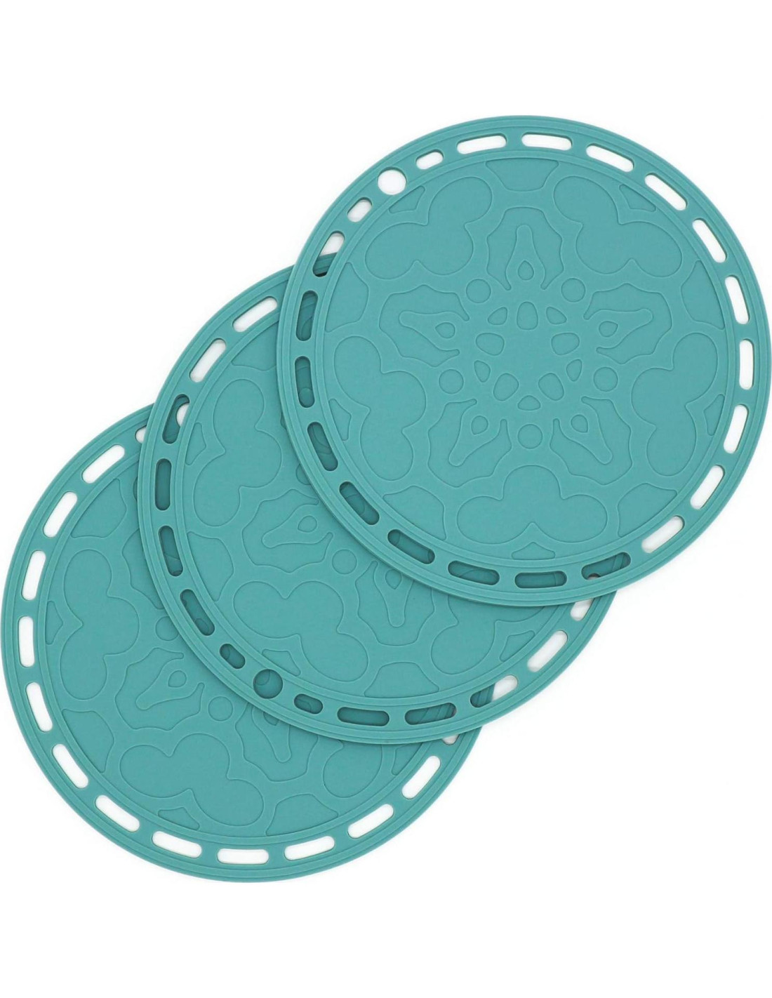 El Juego de Mats de Trivets de Silicona Smithcraft Presenta: Hecho de silicona de grado alimenticio 100%, libre de BPA. No tóxico y sin olor, se puede tocar la comida directamente, manteniendo a usted y a su familia saludables. Temperatura aplicable: -30 a 250 grados Celsius. Resistente a manchas y olores. Textura antideslizante. Sensación suave. Duradero. Flexible. Impermeable. A prueba de lavavajillas. Tamaño del Mat de Trivet para Encimera: 20x20 cm. Peso: 335g por Juego de 3. Fácil de limpiar: simplemente lave a mano nuestro trivet de silicona o colóquelo en el lavavajillas. Enróllalo y guárdalo. Color: Verde Azulado. Paquete Incluido: 3 piezas por un juego. Funciones de los Trivets de Silicona: Mantiene sus manos seguras al manejar sartenes, platos y ollas calientes del horno o la estufa. Se puede usar como trivet, mats de mesa, posavasos, mantel, mat de encimera, protector de taller, mat de secado, abridor de frascos, posavasos, reposapucheros y pelador de ajo o para otras cosas calientes. Protege la parte superior de la estufa, la mesa, el taller o la encimera de quemaduras antiestéticas. Notas: ----- No lo caliente directamente con fuego y no lo raspe con objetos afilados. Satisfacción del Cliente: Si hay algo con lo que no está satisfecho con nuestro artículo o servicios, contáctenos libremente, siempre respondemos en 24 horas y prometemos ofrecer nuestros mejores servicios para usted.