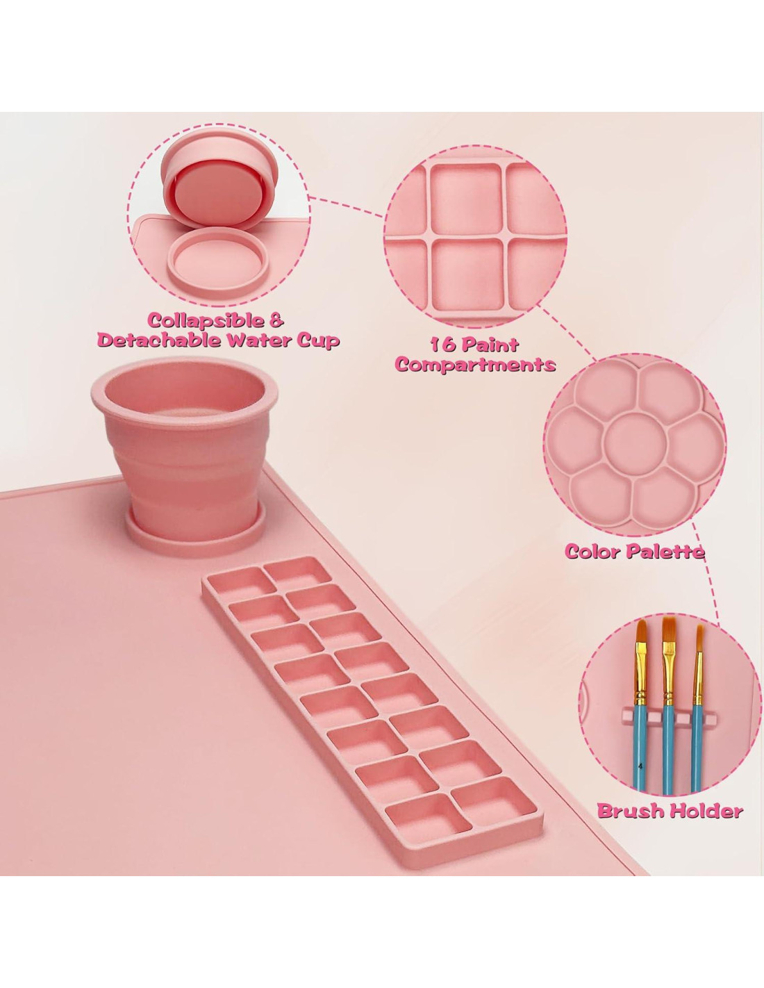 - Alfombrilla de Arte de Silicona Única: La alfombrilla de pintura de silicona tiene una taza adjunta colapsable que se puede llenar, vaciar y limpiar fácilmente, un soporte para pinceles con múltiples pozos de pintura integrados, un soporte para pinceles y 10 Pinceles. El pozo de pintura y el soporte para pinceles están ubicados en la parte superior de la alfombrilla, en lugar de en el lado, porque es más visible y mantiene limpio mientras se crea de manera eficiente.